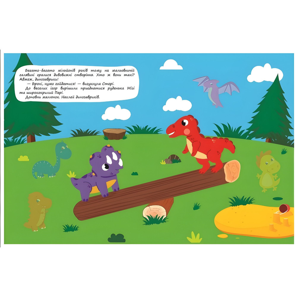 Книжка "Грайливі динозаврики" представлена яскравими малюнками та захоплюючими наліпками великого розміру, які дитина власноруч зможе наклеювати без допомоги дорослих. Кожна історія супроводжується невеличкою цікавою розповіддю чи то про грайливих динозавриків, чи то про веселу ферму, чи то про міський транспорт. Яскраві наліпки допоможуть потренувати дрібну моторику, розвинути увагу, уяву, логічне мислення та пам`ять.