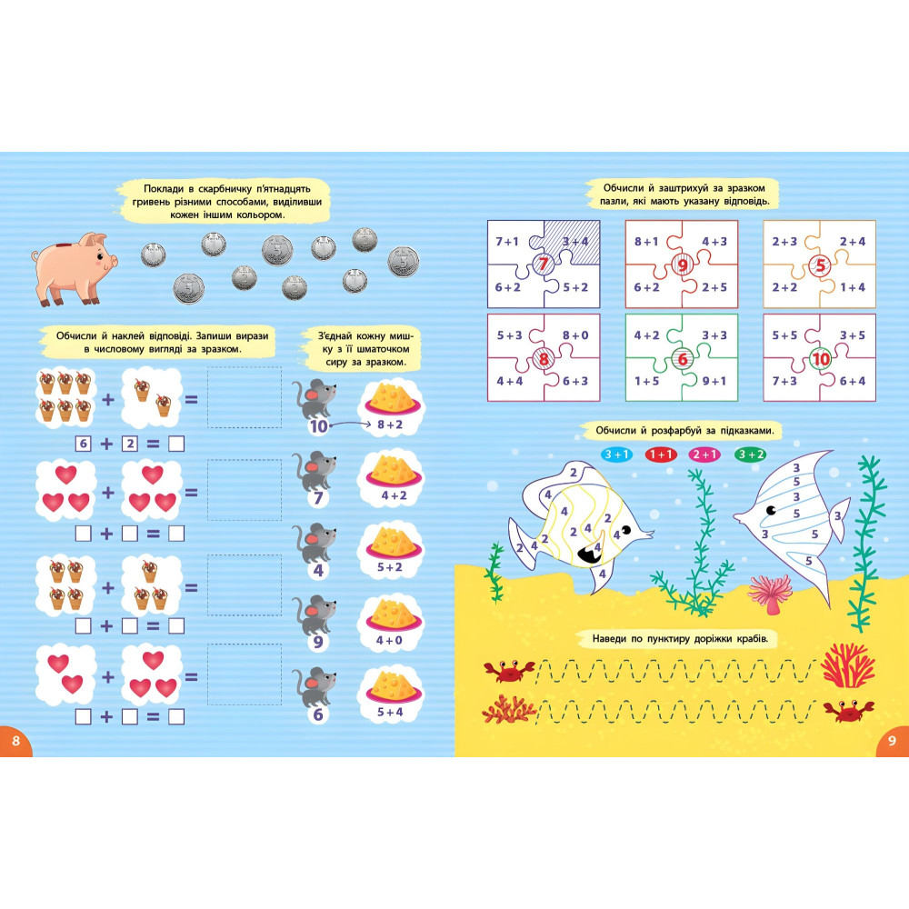 "На сторінках книжки «Математика. Додавання» дитина потренується обчислювати приклади на додавання в межах 20 та записувати числові вирази за малюнками. Видання містить цікаві ігрові завдання, виконання яких потребує використання наліпок, малювання чи запис відповідей, що розвине дрібну моторику, потренує пам’ять та уяву, розвине логічне мислення та увагу. Прості завдання в цікавому оформленні стимулюватимуть до пізнання і вивчення матеріалу, необхідного для дошкільняти. Видання призначене для дітей старшого дошкільного віку та їхніх батьків."