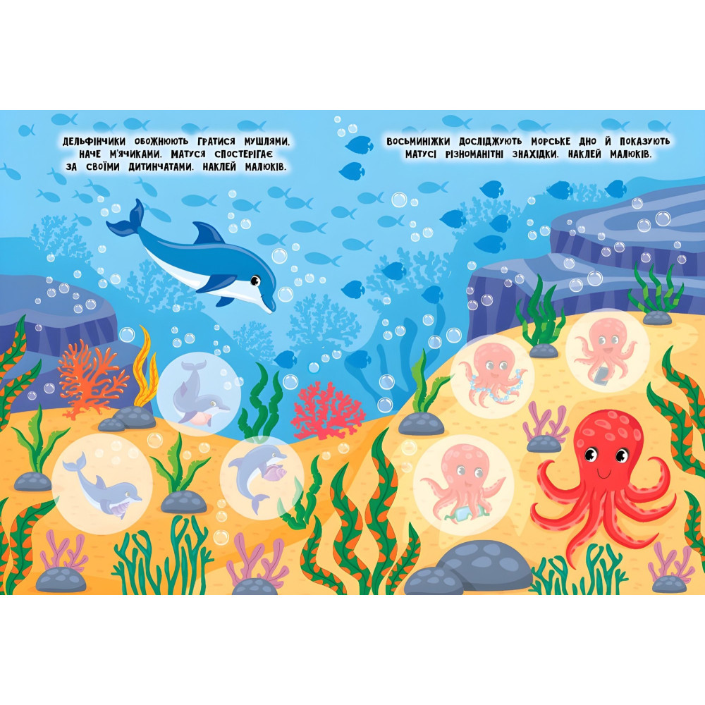 Ця книжка познайомить дітей з мешканцями морів й океанів та їхніми дитинчатами. Вона допоможе запам’ятати їхні назви та дізнатися, що вони люблять робити. Великі наліпки урізноманітнять пізнавальний процес, перетворивши його на цікаву гру. Книжка допоможе розширити кругозір малюка й розвинути дрібну моторику пальців рук.