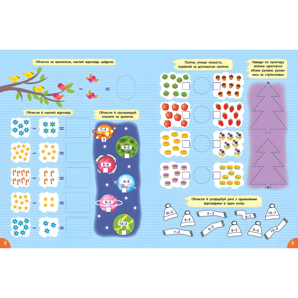 "На сторінках книжки «Математика. Віднімання» дитина потренується обчислювати приклади на віднімання в межах 20, записувати числові вирази за малюнками та ілюструвати приклади. Видання містить цікаві ігрові завдання, виконання яких потребує використання наліпок, малювання чи запис відповідей, що розвине дрібну моторику, потренує пам’ять та уяву, розвине логічне мислення та увагу. Прості завдання в цікавому оформленні стимулюватимуть до пізнання і вивчення матеріалу, необхідного для дошкільняти. Видання призначене для дітей старшого дошкільного віку та їхніх батьків."