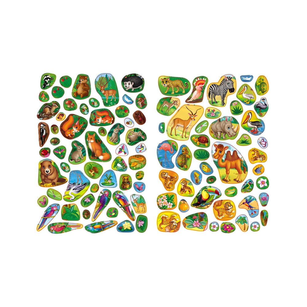 Понад 100 наліпок із зображеннями тварин створюють унікальну можливість дитячій уяві «побувати» у різних куточках планети.Цікаво ж бо дізнатися, як називаються і де живуть, скажімо, ці витончені, з довгими, як у чаплі, ногами птахи рожевого кольору. Чи вісь ці, завбільшки з метелика, маленькі симпатичні пташки.Тому наліпки у цій книжці для малят повною мірою належать до розвивальних. Вони чудово сприяють розвиткові:Кругозору й пізнанню навколишнього світу. На сторінках книжки малюк зустрічається з улюбленими тваринами і знайомиться з невідомими йому представниками фауни,