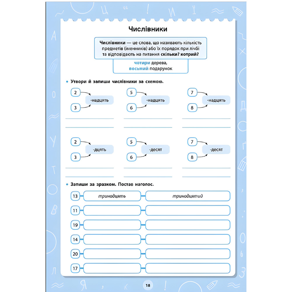 Цей тренажер допоможе дітям легко й ефективно опанувати знання про різні частини мови, а також сформувати навички швидкого та безпомилкового визначення морфологічних ознак слів. Автоматизація цих навичок значно прискорить і спростить роботу над різними розділами шкільної програми й полегшить подальше вивчення української мови. Для успішного відпрацювання цієї теми в тренажері подані різноманітні завдання, а також мотивувальні наліпки, які дитина може використати як для самооцінки, так і для самоперевірки. Зошит буде корисним як додатковий матеріал на уроках чи як помічник для самостійної роботи вдома.