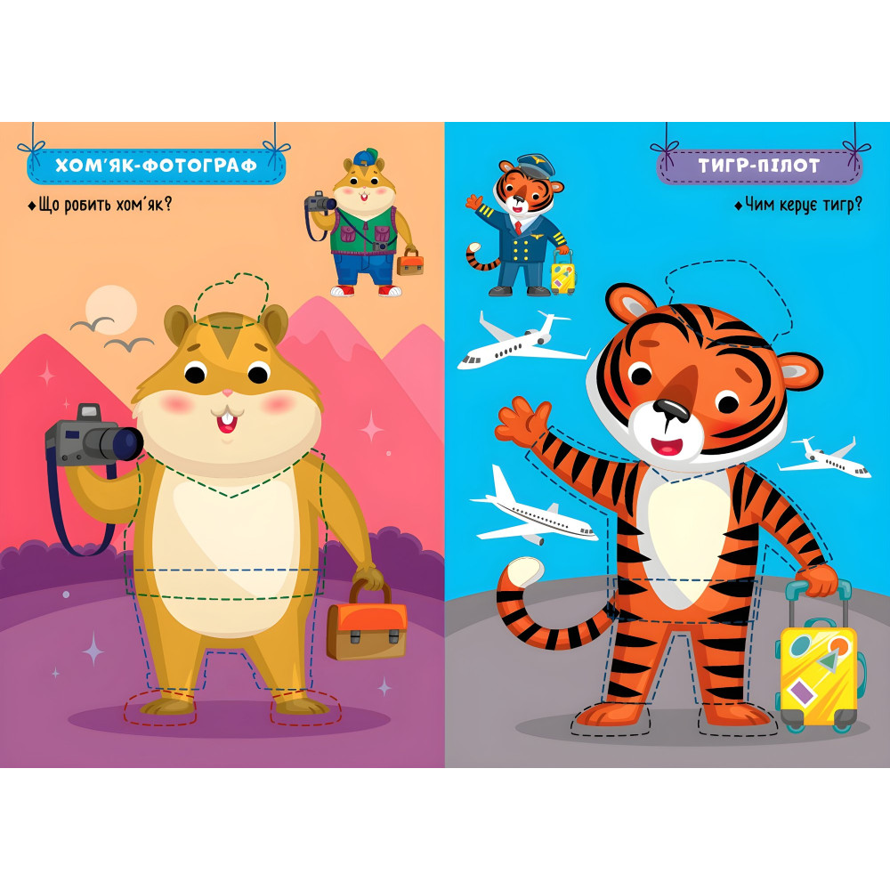 На сторінках цієї книжки малюк не лише познайомиться із кумедними звірятами, а й відкриє для себе дивовижний світ мандрівних професій: від пілота й моряка до фотографа й екскурсовода. Користуючись наліпками й зразком, дитина має вдягнути тваринок відповідно до їхніх занять, а також доклеїти предмети, якими вони користуються під час роботи. Симпатичні кумедні звірята обов’язково сподобаються малюкові, а яскраві наліпки-вдягалки не лише забезпечать цікаве й пізнавальне дозвілля, а й допоможуть розвинути дрібну моторику, увагу та логічне мислення. Видання призначене для спільної роботи дорослих із дітьми дошкільного віку."