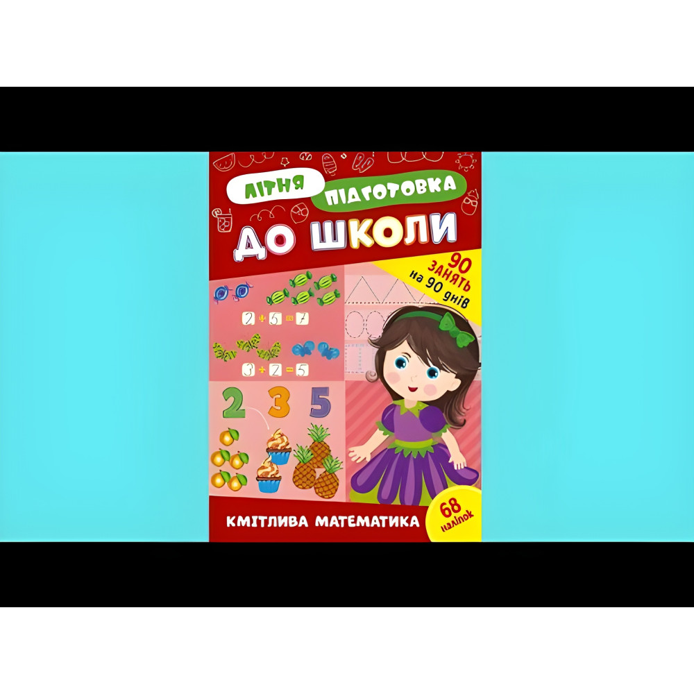 "Серія «Літня підготовка до школи» — незамінний репетитор для майбутніх успішних першокласників. Кожна книжка містить 90 завдань, розрахованих на щодень літа. Комплексна робота з усіма виданнями серії допоможе повправлятися в математиці, логіці, читанні, довкіллі, англійській мові та прописах. Цікаві завдання будуть запорукою якісного й захопливого процесу підготовки для дошкільнят, адже всі вони подані від простого до складного й передбачають використання олівців чи наліпок, що допоможе потренувати дрібну моторику пальців рук. Із книжкою «Кмітлива математика» дитина пригадає фігури й навчиться розпізнавати їх серед предметів; виконає вправи з величинами: буде визначати й порівнювати більше — менше, вище — нижче, важче — легше; вивчить цифри та навчиться їх співвідносити з відповідною кількістю, а також потренується малювати фігури, писати цифри та складати й обчислювати вирази. Видання призначене для спільної роботи дорослих із дітьми дошкільного віку."