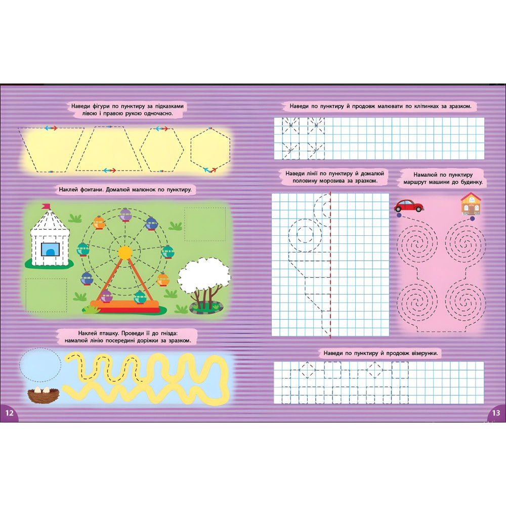 На сторінках книжки «Прописи. Лінії та візерунки» дитина малюватиме фігури й лінії в різних напрямках лівою і правою рукою по черзі чи одночасно, обводитиме по пунктиру елементи сюжетних малюнків і доповнюватиме їх наліпками, повторюватиме лінії та зображення по точках, домальовуватиме другу частину малюнка чи відтворюватиме його повністю за зразком по клітинках. Видання допоможе дитині вивчити літери й потренувати увагу та пам’ять, а також розвинути дрібну моторику.