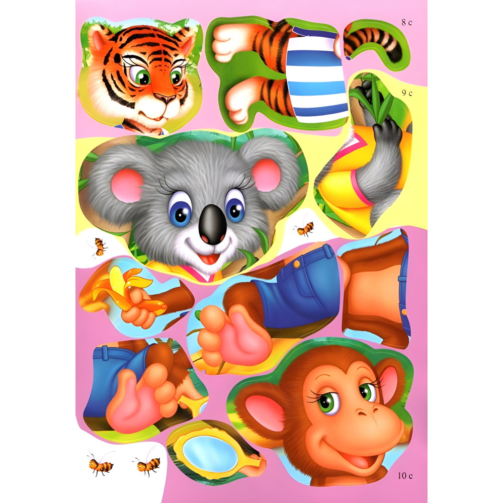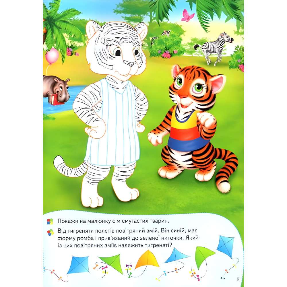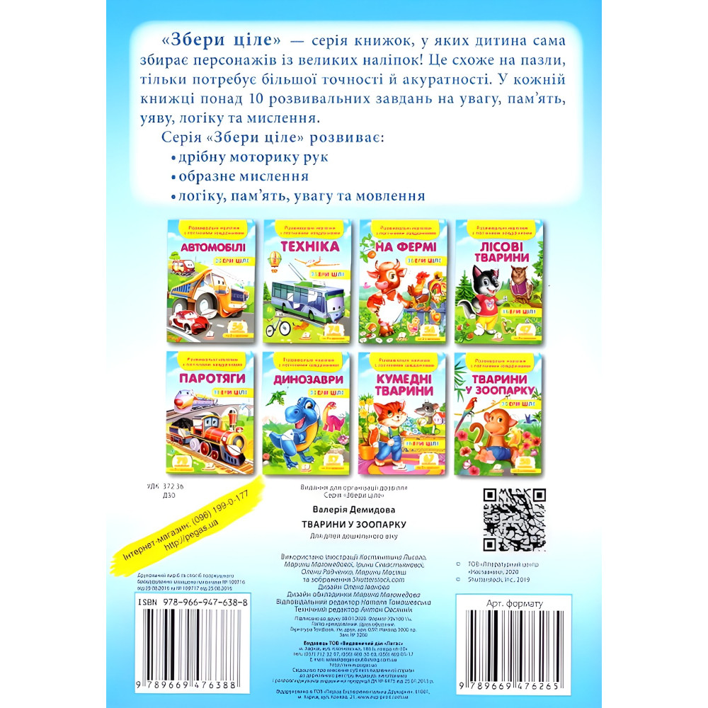Які бувають зоопарки? У багатьох країнах на всіх континентах просто приголомшливі, інакше не скажеш, зоопарки, заповідники, природні заповідники і зоологічні центри — по-різному називаються ці острівці живої дикої природи. У Пекінському зоопарку, наприклад, можна потоваришувати з великою пандою. А в Куала-Лумпурському парку птахів у Малайзії — потрапити у світ папуг і країну птахів-носорогів! Як цікаво поспостерігати за слонами у Берлінському зоопарку! А ось у якому зоопарку світу можна побувати на змаганнях бегемота і крокодила? Чи позайматися на стадіоні фізкультурою з... лівому! А здавати до бібліотеки книжки разом із... зеброю? Такого й уві сні не побачиш, не ті, що в зоопарку! А в книжці з розвивальними наліпками і логічними завданнями у серії «Збери ціле» усе це запросто! Вже на першій сторінці бачимо, як бегемот переможно фінішує, бо у нього є весла, а у крокодила їх немає! Наші тварини в зоопарку життєрадісні й товариські! Вони приготували дітлахам 21 логічне завдання! Для чого? Звичайно ж, для цікавої гри! Що потрібно від дітей для такої незвичайної грі з нашим жирафом, слоном, носорогом і тиграми? Не так і багато: активна уява; уважність; навички лічби від 0 до 10; порівняльне мислення. 50 наліпок на тему «Тварини в зоопарку» допоможуть малюкам краще і глибше виявити ці якості.