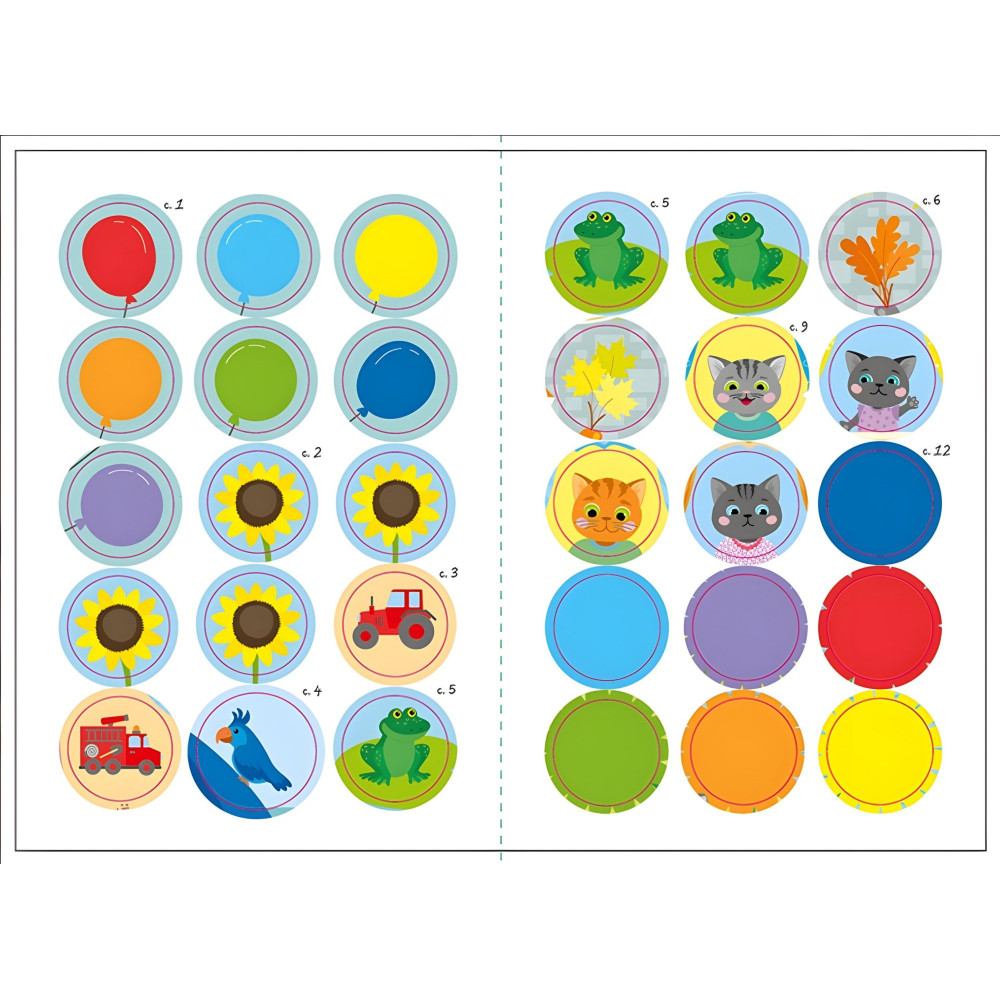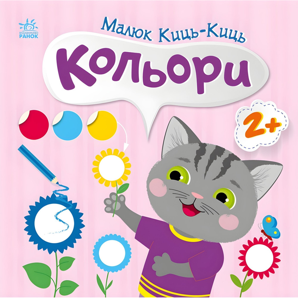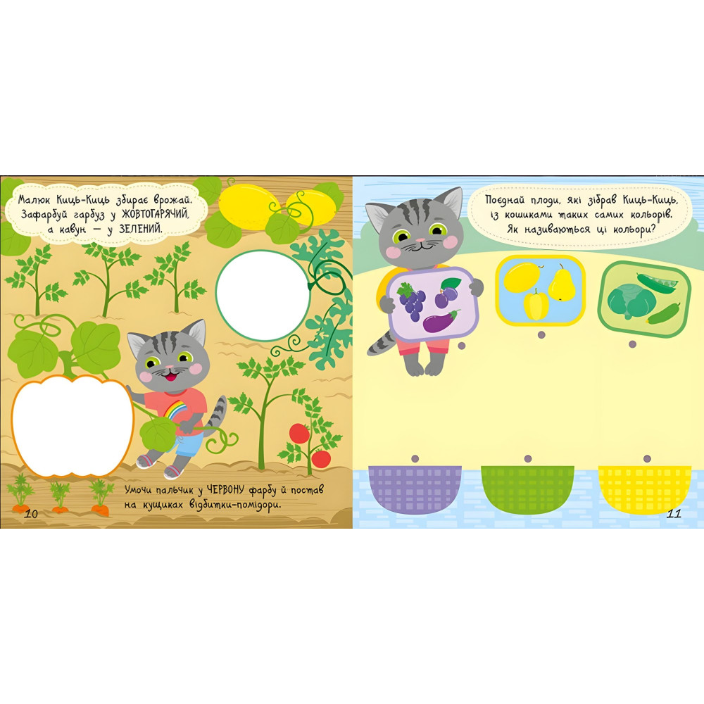 Світ довкола такий барвистий! Разом із кошеням Киць-Кицем малюк досліджуватиме різні кольори. Фарбувати сонце в жовтий, клеїтиме зелених жабок, шукатиме барвисте осіннє листя, малюватиме пальчиком фіолетові сливи... Різноманітні завдання та яскраві наліпки не тільки розважать дитину, а й допоможуть вивчати та запам’ятовувати основні кольори