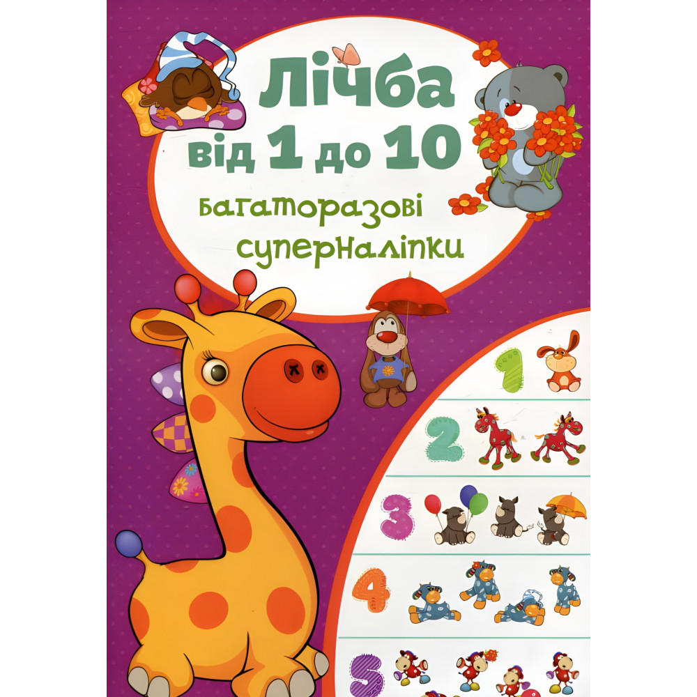 Ця книжка допоможе малюку навчитися рахувати від 1 до 10. Багаторазові наліпки допоможуть дитині в ігровій формі закріпити нові знання. Навчайтеся із задоволенням!