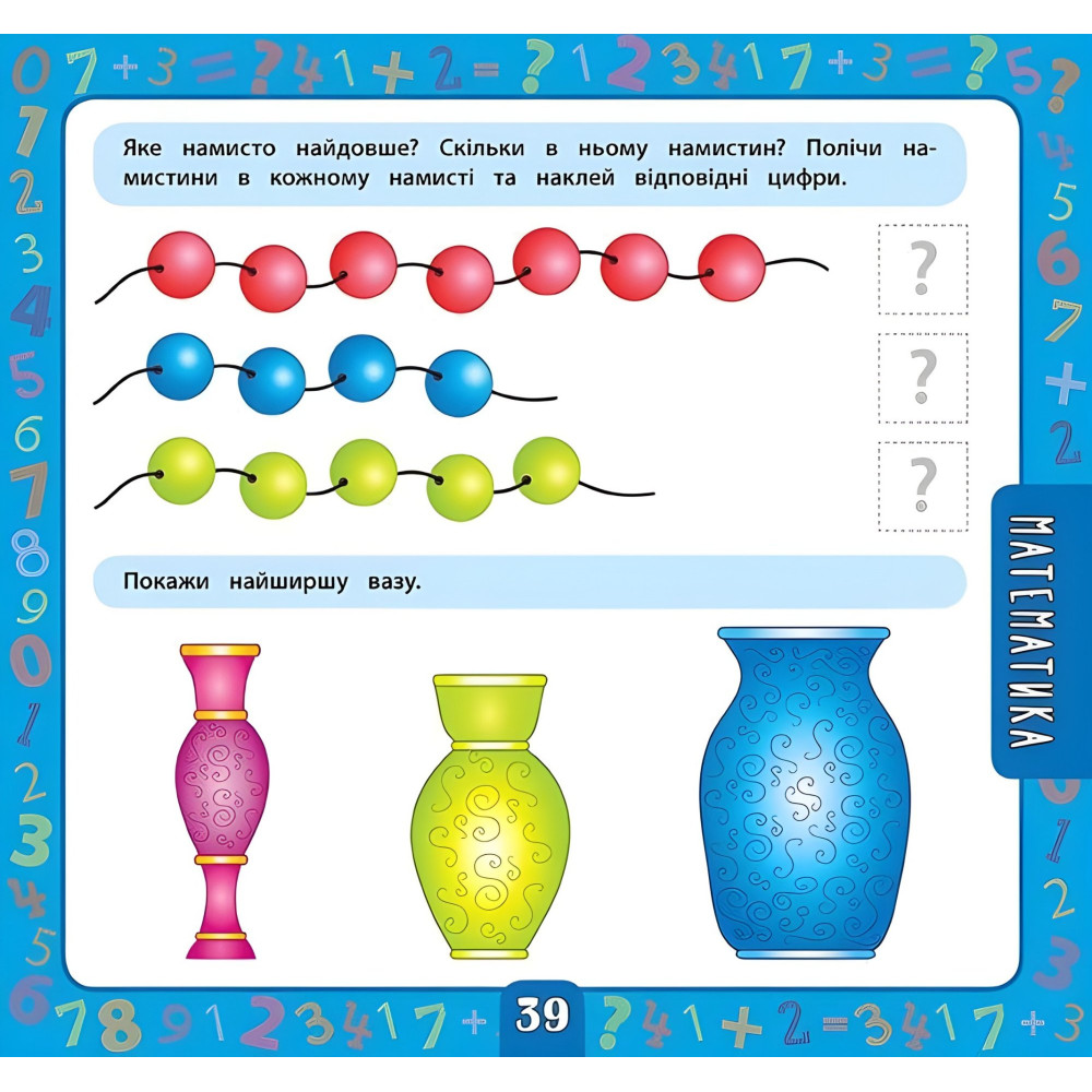 Із цією книжкою ваш малюк познайомиться із цифрами та повправляється в лічбі, навчиться називати букви українського алфавіту, розпізнавати їх і поєднувати в склади та слова.Ще дитина потренується порівнювати предмети за розміром, кількістю, формою, кольором і візерунком, установлювати логічні зв’язки між ними, поєднувати предмети в смислові групи, аналізувати та знаходити зайве або протилежне за змістом, познайомиться з поняттями «широкий і вузький», «довгий і короткий», «ліворуч і праворуч». Також малюк навчиться малювати різноманітні лінії, фігури та візерунки по пунктиру й самостійно, потренується штрихувати та малювати за зразком.Видання призначене для спільної роботи дітей віком від трьох років з батьками.