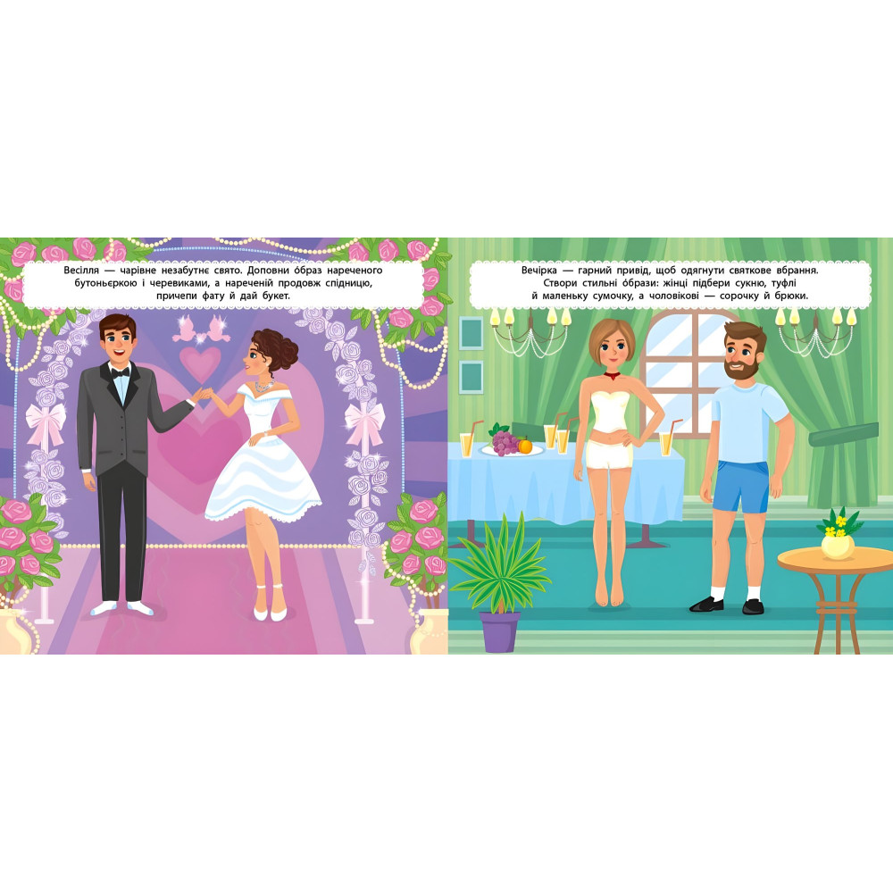 Разом із цією книжкою дитина відчує себе справжнім стилістом і зможе за допомогою наліпок утілити в життя своє бачення стильного й неповторного образу. На сторінках книжки малюк підбере святковий одяг й аксесуари для весілля і дня народження, яскраві костюми для маскараду та Геловіну, неповторні костюми для танцювальних виступів, створить колоритні образи до Дня вишиванки й утілить у життя оригінальні й цікаві ідеї для піратської та гавайської вечірок.