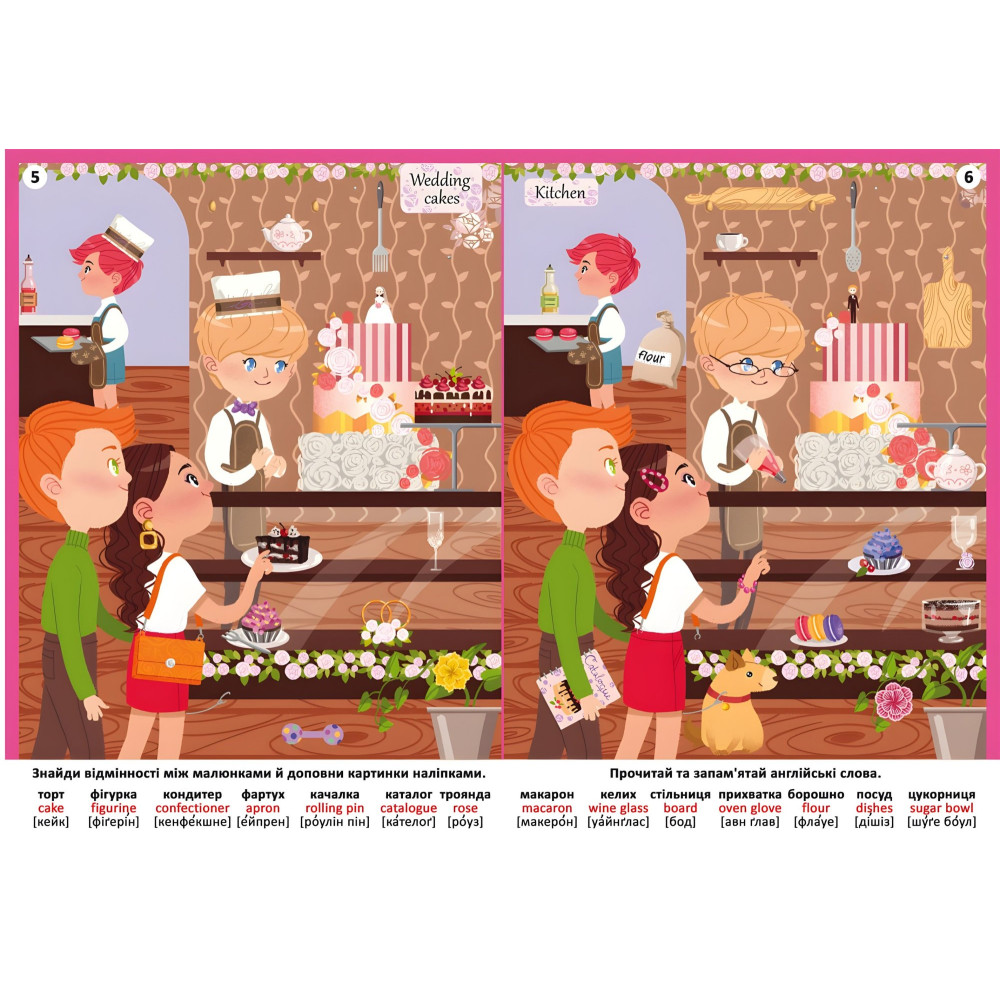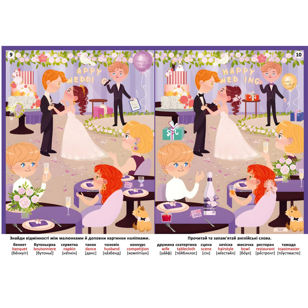 Весілля – це подія, на яку з нетерпінням чекає кожна дівчина. На розворот цієї книги ти разом із нареченою Виберіть красиву сукню, замовиш весільний торт і побуваєш на дівич-вечорі. Однак на кожному малюнку чого не вистачає. Уважно розгляньте дві подібні картинки, виявило між ними розбіжності та усуне їх, доповнено Малюнок наклейками! Книга розвиває дрібну моторику, Рамус та логічне мислення, вона познайомить з англійськими словами та допоможе їх вивчити, а 205 наклейок подарують дитині багато годин захоплюючого дозвілля!