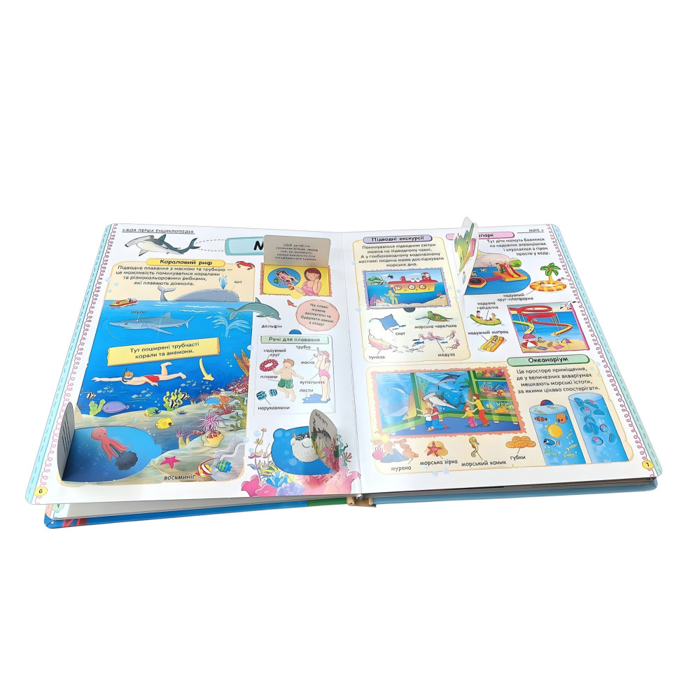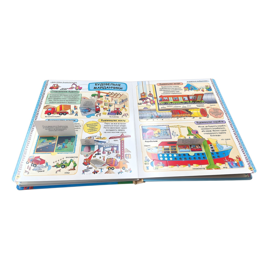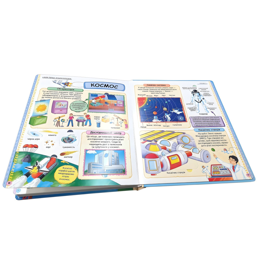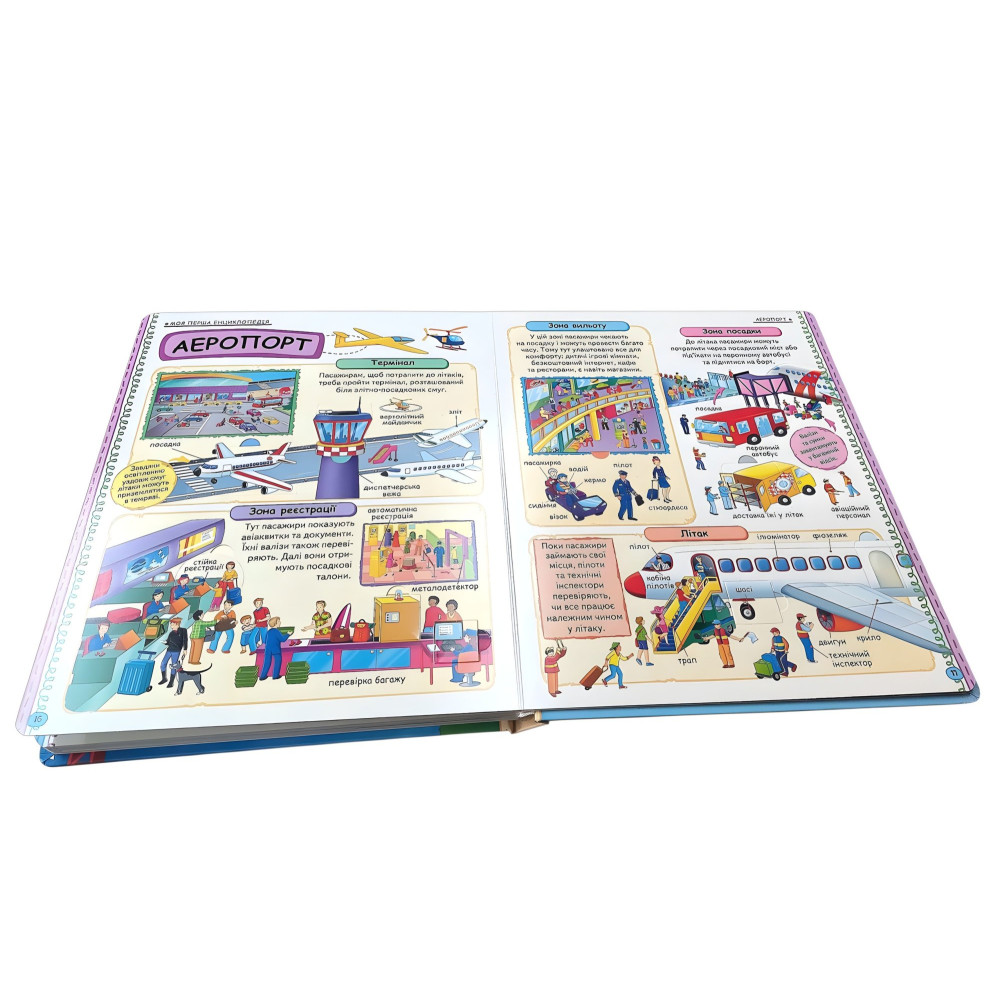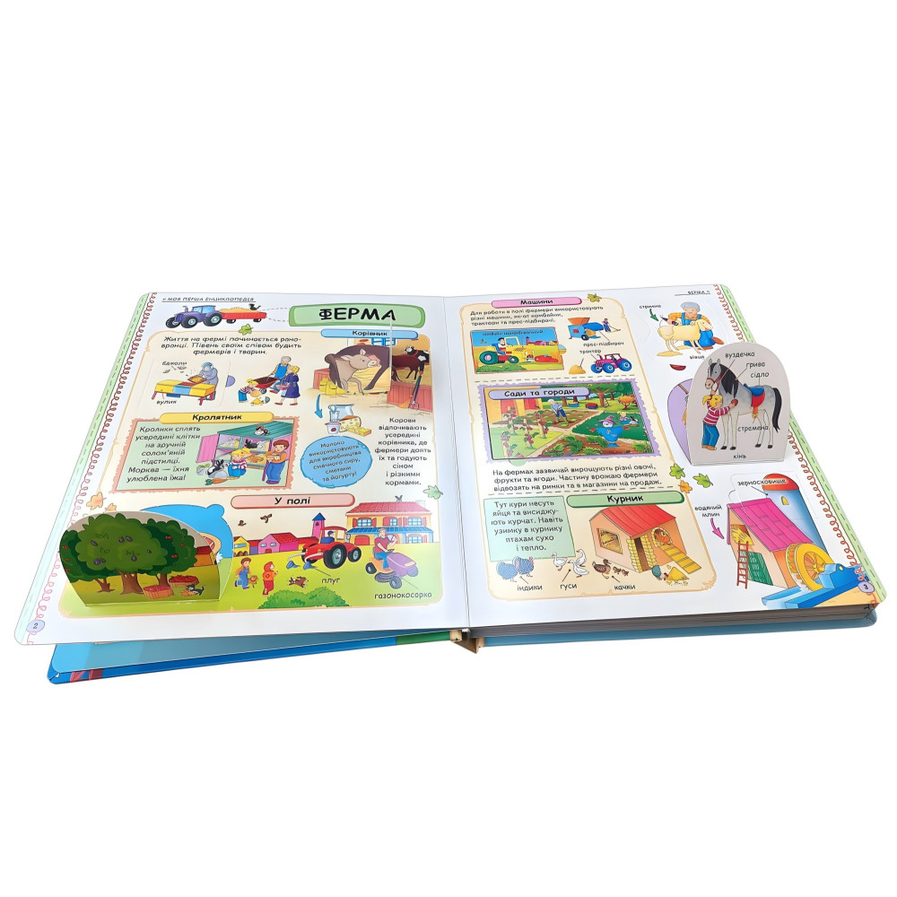 «Моя перша енциклопедія» із серії «Світ у віконцях» - подарункове картонне видання у великому форматі, яке поєднує навчання та гру. На міцних сторінках розташовані віконця-сюрпризи, що приховують найцікавіші факти та роблять процес пізнання захопливим. У книзі діти знайдуть відповіді на сотні питань про навколишній світ: Ферма - життя тварин і рослин, робота пасіки, догляд за худобою. Тварини - мешканці савани, джунглів, лісів, пустель. Море - корали, риби, глибини та таємниці океану. Місто - транспорт, будівлі, магазини та міський простір. Рятувальні служби - пожежники, медики, рятувальники на суші та воді. Будівництво - як створюють мости, метро, кораблі. Аеропорт - літаки, зліт, посадка, робота летовища. Космос - планети, ракети, телескопи, чорні діри та зорі. Видання допомагає дітям, розширювати кругозір, розвивати пам’ять, увагу та пізнавальний інтерес. Це чудовий подарунок для маленького дослідника.