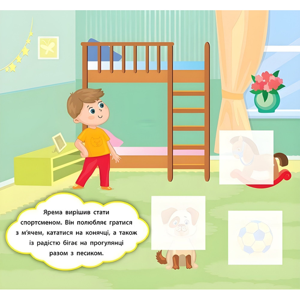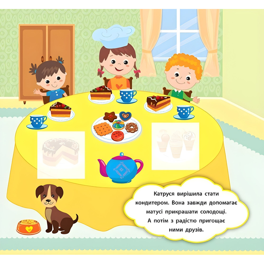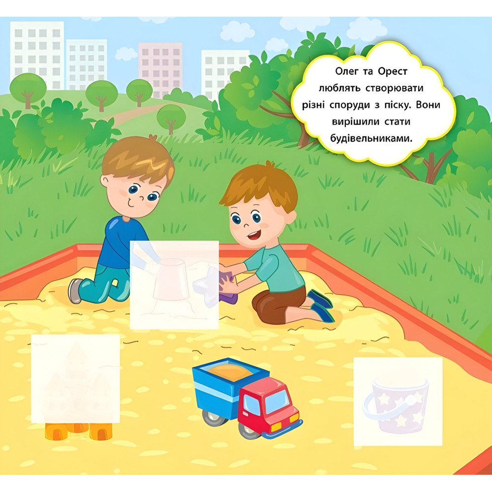 Ця книга розповість про різні ігри, які допоможуть малюкам відкрити для себе цікаві професії: вчителя, кондитера, будівельника, пілота, ветеринара та інші. Також видання навчить малюків розрізняти поняття цілого та його частини. За допомогою фрагментів-наклейок дитина зможе доповнювати яскраві картинки, а короткі розповіді на кожній сторінці допоможуть батькам зацікавити малюка та стануть гарним поштовхом до створення власних історій. Книга сприятиме розвитку логічного мислення, фантазії, мовлення, уваги та дрібної моторики пальців рук. Видання призначене для спільної роботи дорослих із дітьми віком від двох років.