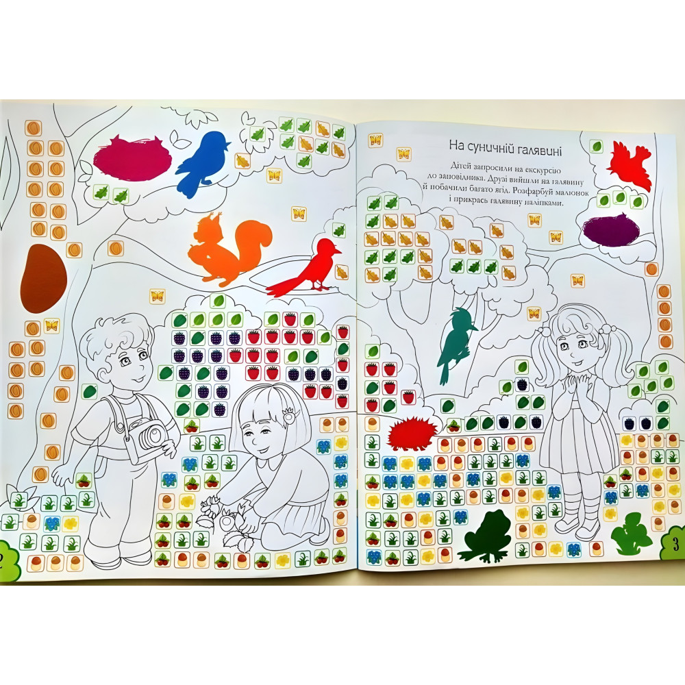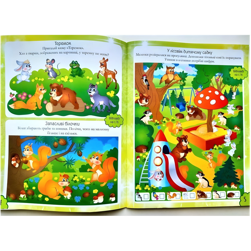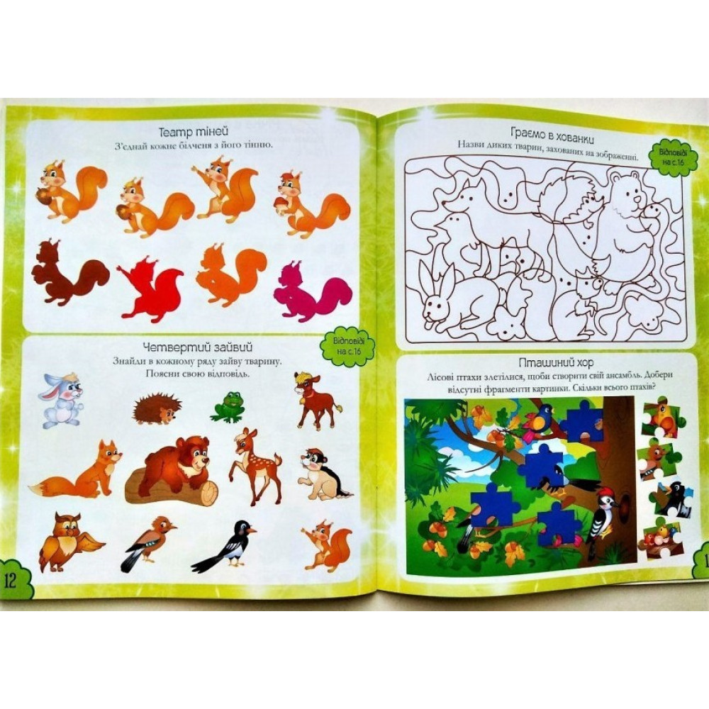 Книга-альбом для наліпок «Лісові звірятка» — книжка для молодшого дошкільного віку, що розвиває найважливіші грані й навички мислення від 3 до 5 років: кмітливість; догадливість; увагу і зосередженість; гарну пам’ять; навички інтелектуальної роботи протягом певного часу; навички художньої прикладної творчості. Розгорнувши перший розворот, діти одразу ж потрапляють на екскурсію сонячною галявиною заповідника. Правда, для того, щоб на галявинці по-справжньому виграло сонечко, малюкові необхідно її «оживити». Як? Дуже просто! За допомогою різнобарвних наліпок. У книзі-альбомі їх стільки, що вистачить на багато днів зосереджених занять. Тим паче, такі заняття не лише захопливі, а й вельми корисні. Вони потребують уважності, спостережливості та посидючості. Далі маленький читач потрапляє в чарівний казковий світ, де головні герої — ті самі лісові звірятка, його добрі друзі з інших книжок. У казці «Теремок» потрібно залишити тільки тих лісових друзів, які оселилися в теремку за сюжетом казки. А потім на малюка чекає дивовижний лісовий дитячий садок. Стільки тут звірят, спробуй-но полічи! А треба ж! Он вихователька сова взялася до діла, і їй конче потрібна допомога дітей. А ще в книжці є заплутані лабіринти, цікаві яскраві ігри для чималої групи малюків, загадки у малюнках, дитячі головоломки. Одне слово, ігрових завдань у наліпках-мозаїках «Лісові звірятка» так багато, що вистачить на розвиток усіх видів дитячого мислення. А враховуючи яскраве, залите зеленими «лісовими» барвами подання обкладинки, скажіть, чим це не чудовий подарунок для малюка?!