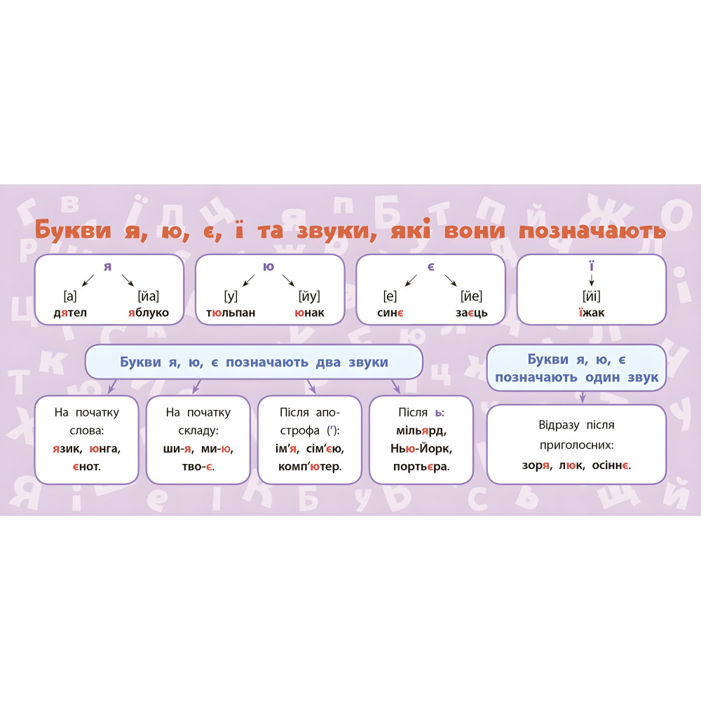 Видання охоплює базовий матеріал 1 класу з предмету «Українська мова» та відповідає вимогам освітніх програм мовно-літературної галузі Нової української школи. Книжка містить яскраві та змістовні матеріали, які представлено в зрозумілій візуалізованій формі. Видання стані чудовими помічником для учнів 1-4 класів, їхніх батьків та вчителів початкової школи.