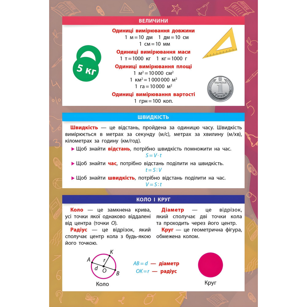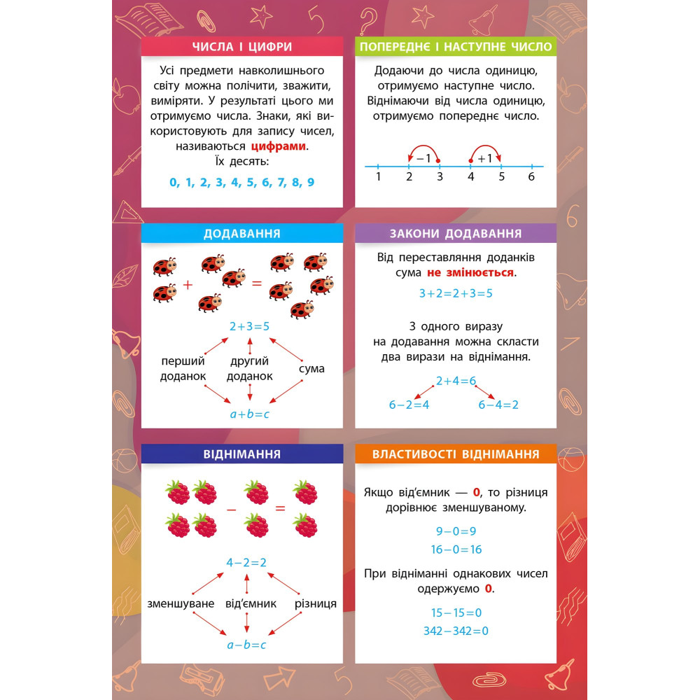 Це видання охоплює базовий матеріал 1-4 класів з предмету «Математика» та відповідає вимогам освітніх програм МОН України. Посібник дозволить швидко відновити в пам'яті відомі правила, а також легко засвоїти нові, а отже, стане чудовим помічником для учнів початкових класів, їхніх батьків і вчителів.