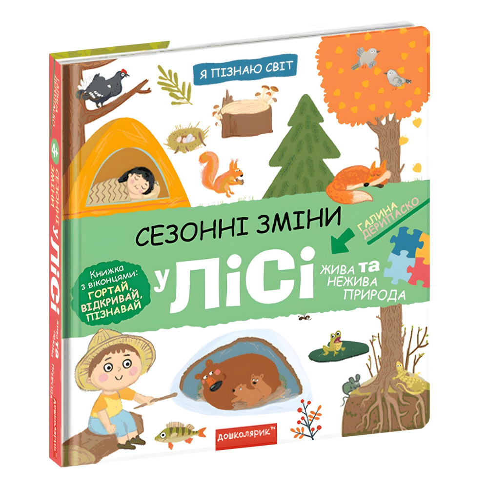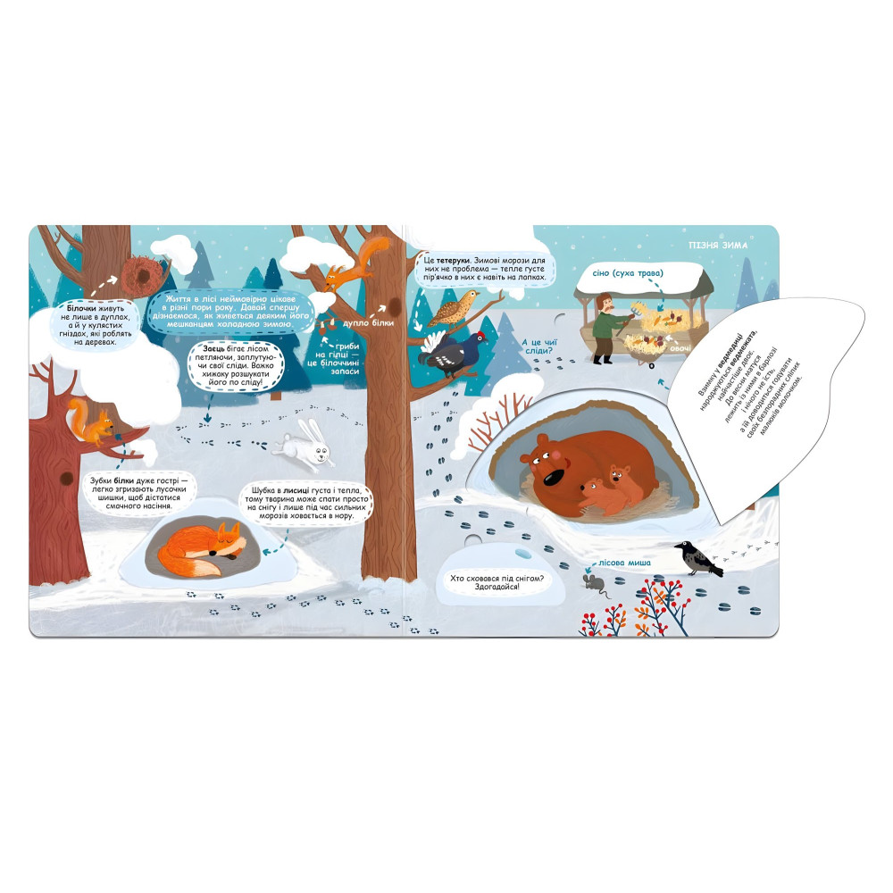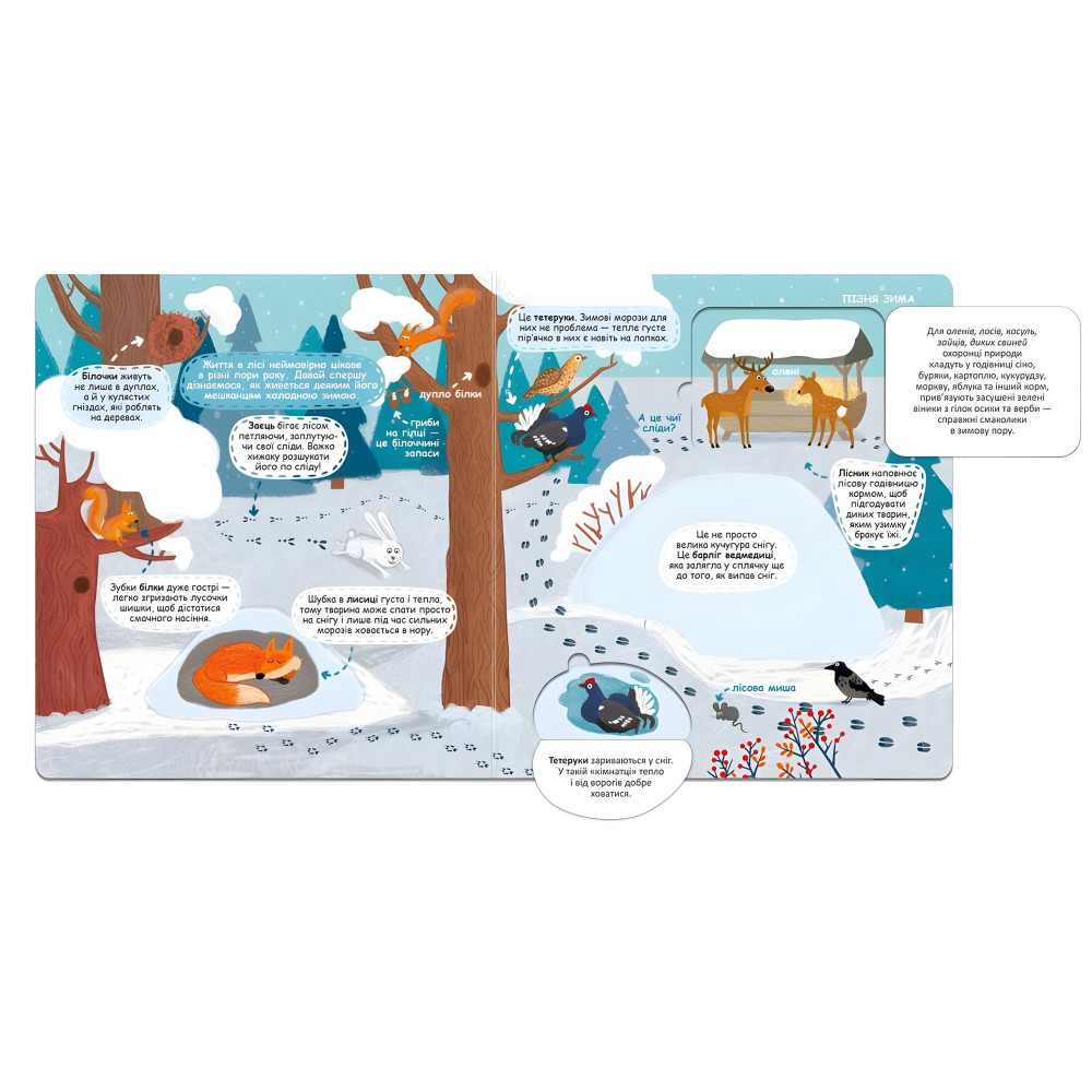 Ця книжка є справжньою енциклопедією життя лісових тварин і рослин. Розглядаючи чудові малюнки та відкриваючи «віконця», пізнавайте красу та таємниці лісу! Дізнавайтеся, як живуть лісові мешканці, чим харчуються, як готуються до зими, які тварини сплять удень, а які — вночі, хто з них робить найкращі запаси… Книга навчить помічати сезонні зміни в природі, дбайливо ставитися до тварин і рослин та любити все живе. Для читання дорослими дітям.