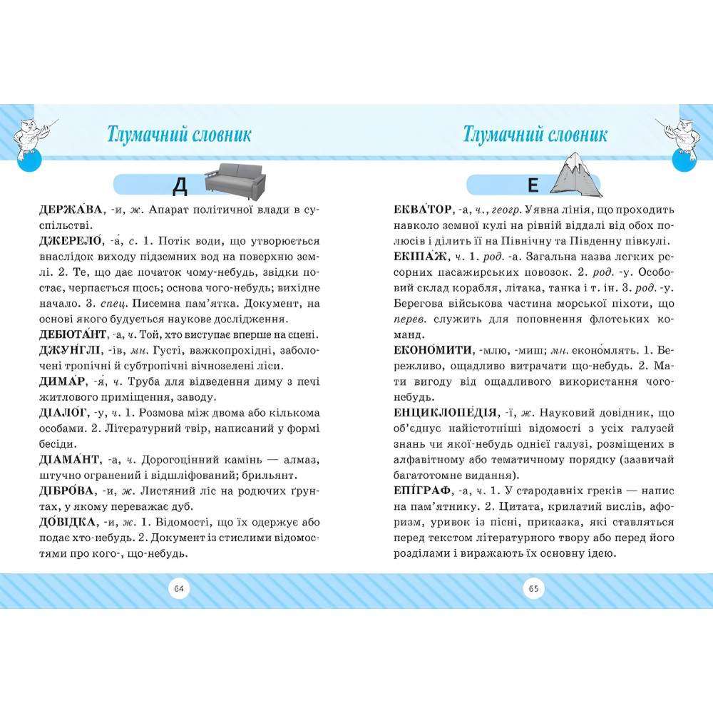 У молодшому шкільному віці у дітей дуже сильна спрага знань і перемог, прагнення в усьому бути кращими і виконувати всі поради і вимоги вчителей. Підтримайте це прагнення на першому етапі навчання, і ви не будете відчувати великих проблем в старших класах.Видання містить такі словники:ОрфографічнийТлумачнийФразеологічнийУкраїнська-російськаБудови словаНаголосівМожливо, ви вже маєте такі словники . Але зважте, які вони важкі та громіздкі. І шукати в них потрібні слова чи поняття довго. В запропонованої книзі все словникові статті підібрані відповідно до програми початкових класів, до того ж це видання легко поміститься в портфелі і не будуть обтяжувати дитину. Такий словник стане надійним помічником при вивченні всіх предметів, їм можна користуватися як у школі, так і вдома. З ним діти навчаться писати без помилок, доречно вживати слова і поняття, грамотно будувати своє мовлення.
