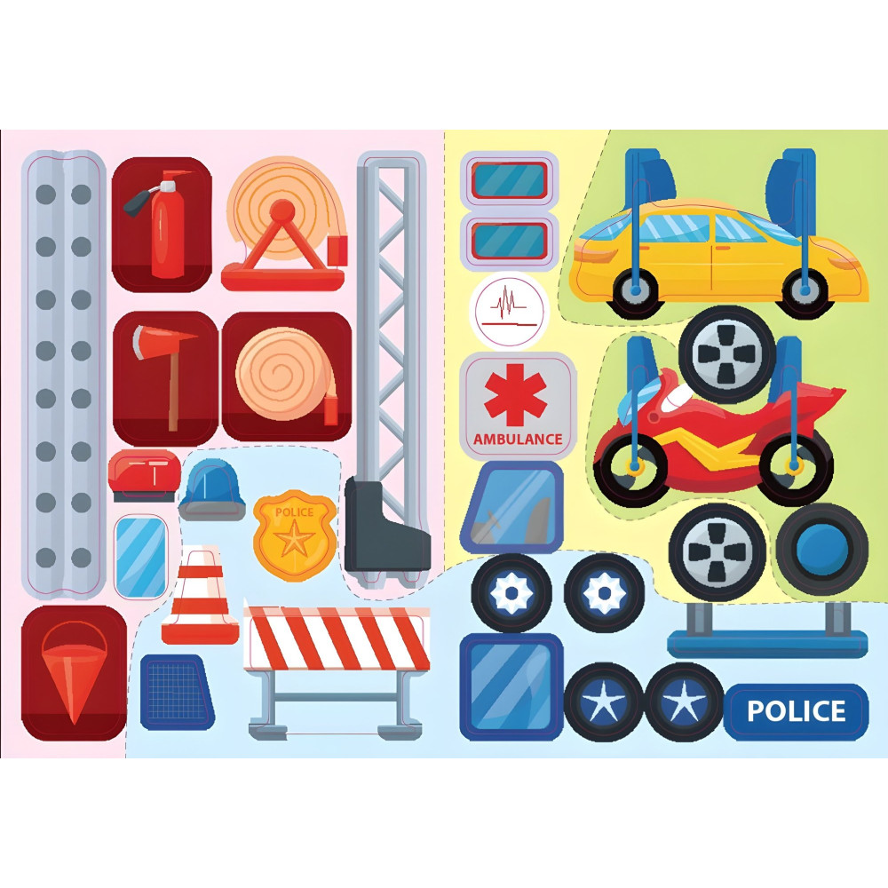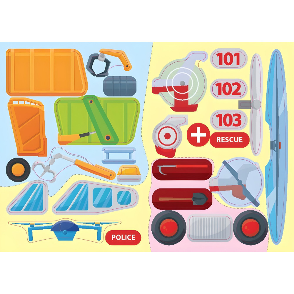 Це яскраве видання обов’язково сподобається маленьким розумникам, оскільки дасть їм змогу створити власні моделі спеціального транспорту. Кмітливі проектувальники потренуються збирати пожежну й поліційну машини, сміттєвоз та евакуатор, машину швидкої допомоги й евакуаційний вертоліт. Барвисті наліпки та нестандартний формат сприятимуть розвитку творчого мислення, фантазії, уяви, уваги та дрібної моторики.