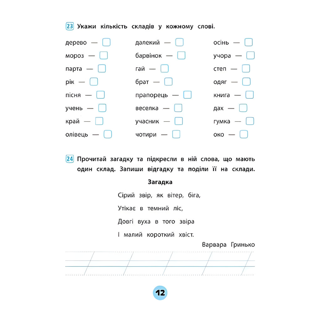 Посібник допоможе учням 1 класу повторити алфавіт, удосконалити навички роботи з буквами і звуками, повправлятися в правописі апострофа, знака м якшення, буквосполучень «йо» і «ьо» та поділі слів на склади, а також закріпити знання про слово, речення й текст.Перевірити правильність рішення допоможуть ключі, що знаходяться в кінці зошита. Матеріал відповідає освітній програмі з української мови для 1-4 класів.