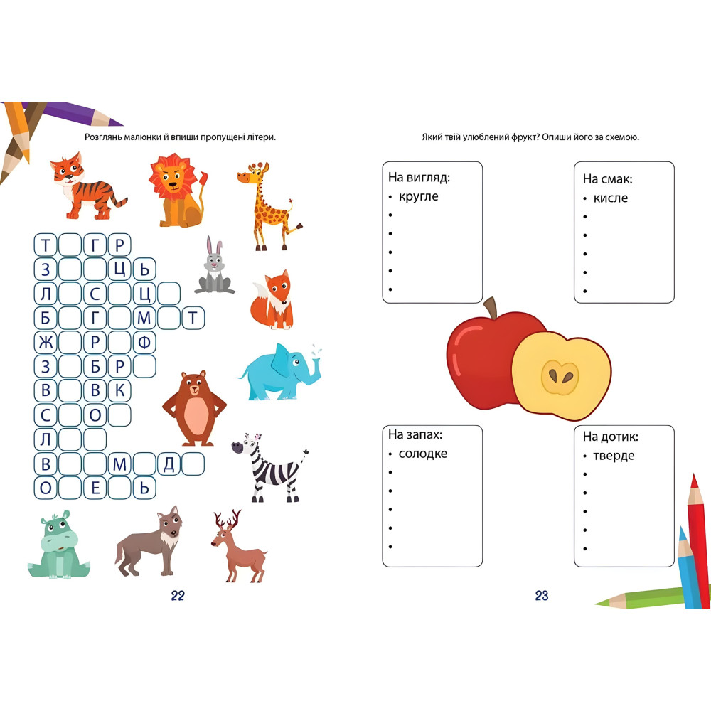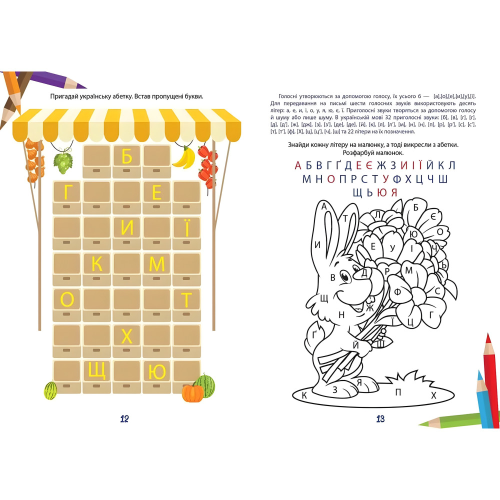 З цією книгою навчання перетвориться на цікаву гру. Діти обожнюють малювати, так що охоче розфарбують прості забавні малюнки до українського алфавіту. Разом з тим вивчать букви і потрібні писати її в прописі. Цікавих задач в книзі багато: мовні ігри, лабіринти, кросворди, ребуси... Завдання подарують дитині гарний настрій і корисні знання.