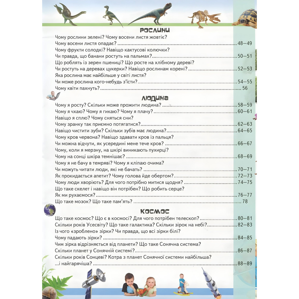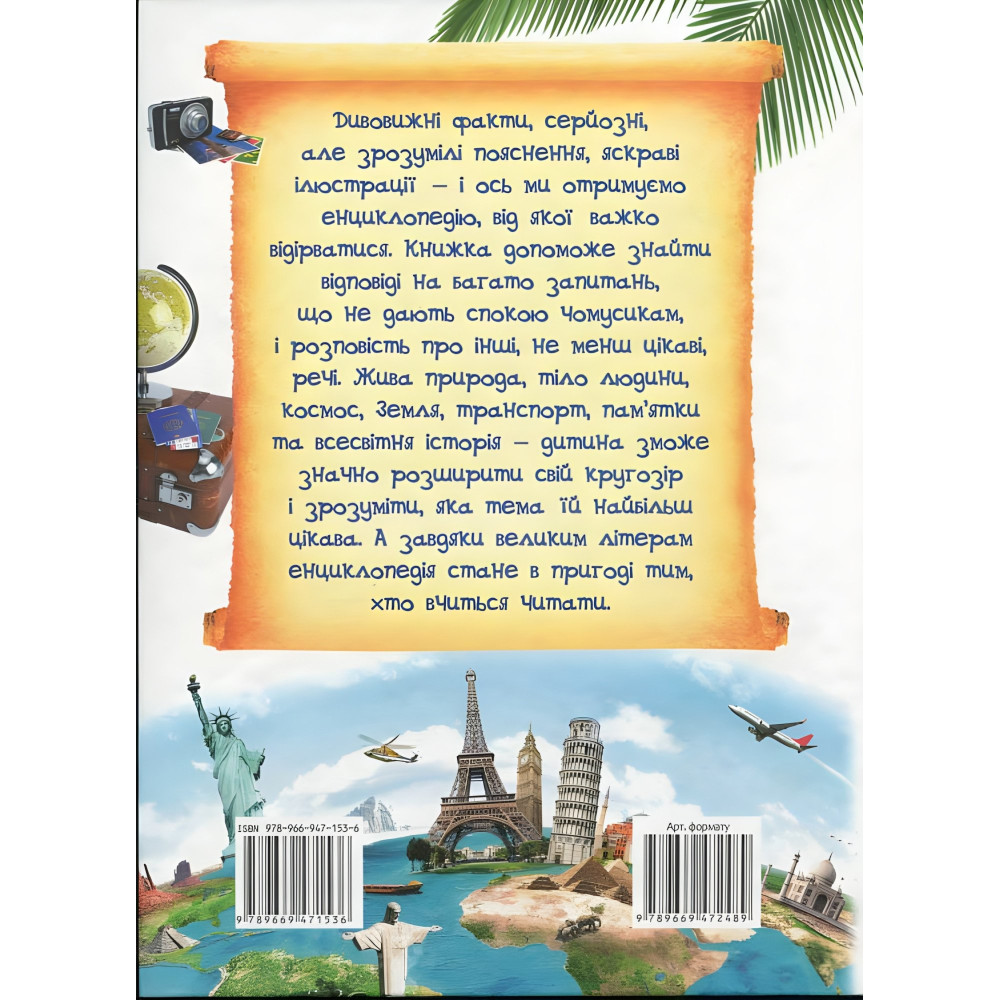 Дивовижні факти, серйозні, але зрозумілі пояснення, яскраві ілюстрації - і вісь ми отримуємо енциклопедію, від якої важко відірватися. Книжка допоможе знайте відповіді на багато запитань, що не дають спокою чомусикам, і розповість про інші, не менш цікаві, речі. Жива природа, тіло людини, космос, земля, транспорт, пам ятки та всесвітня історія - дитина зможе значно розширити свій кругозір і зрозуміти, яка тема їй найбільш цікава. А завдяки великим літерам енциклопедія стане у пригоді тим, хто вчиться читати.