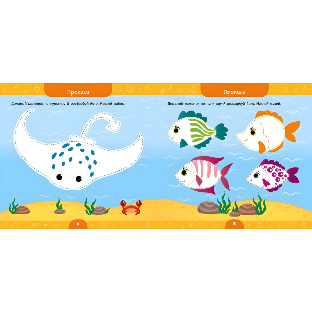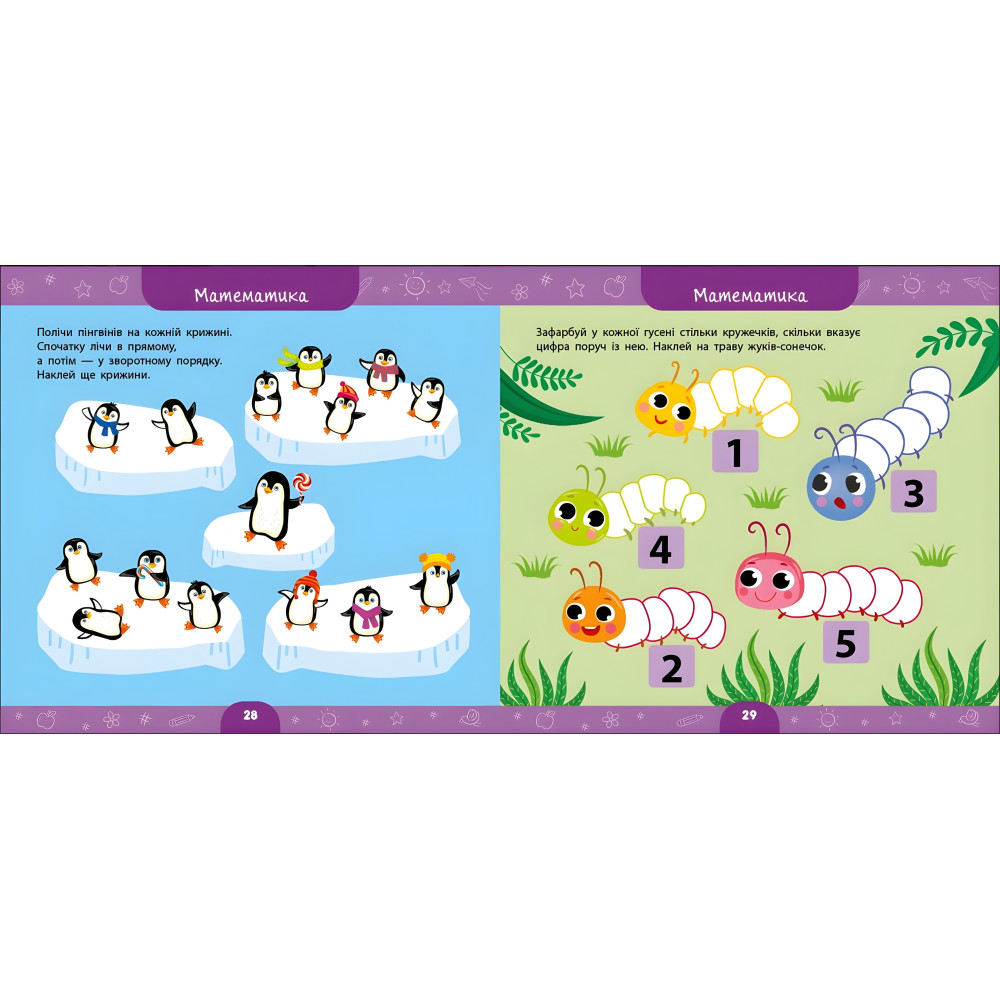 "Ця книжка допоможе вам організувати пізнавальне й захопливе дозвілля для малюка. Яскраві ілюстрації привернуть його увагу, цікаві завдання допоможуть пізнати світ, запам’ятати щось нове, розвинути увагу й мислення, а робота з наліпками сприятиме покращанню дрібної моторики. Матеріал у кожному розділі подано від простого до складного, а кмітливі персонажі, що мандрують сторінками книжки, заохочуватимуть малюка виконувати їх. Видання призначене для спільної роботи дорослих з дітьми дошкільного віку."