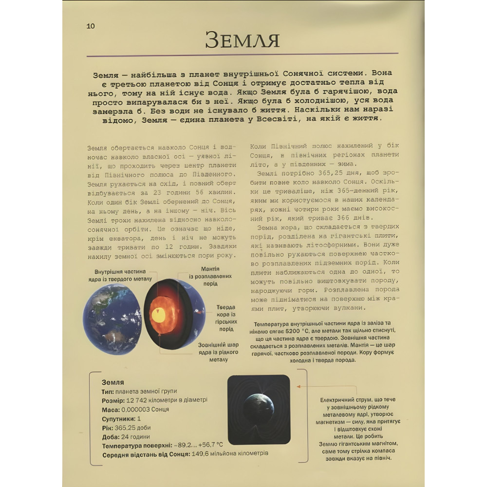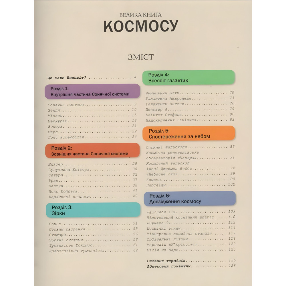 Як стати космонавтом? Чи є вода на Марсі? Якого розміру галактика? «Велика книга космосу» відповість на ці та багато інших питань. Юні читачі зможуть спуститися на кожну планету Сонячної системи, а також дізнаються: • як далеко може «бачити» телескоп; • коли утворився Місяць; • як почуваються космонавти на МКС. Професійні високоякісні фотографії та ілюстрації розкриють секрети планет, астероїдів, галактик і навіть чорних дір. Під час подорожі дослідники опиняться далі, ніж могли собі уявити. І їм навіть не доведеться покидати планету Земля!