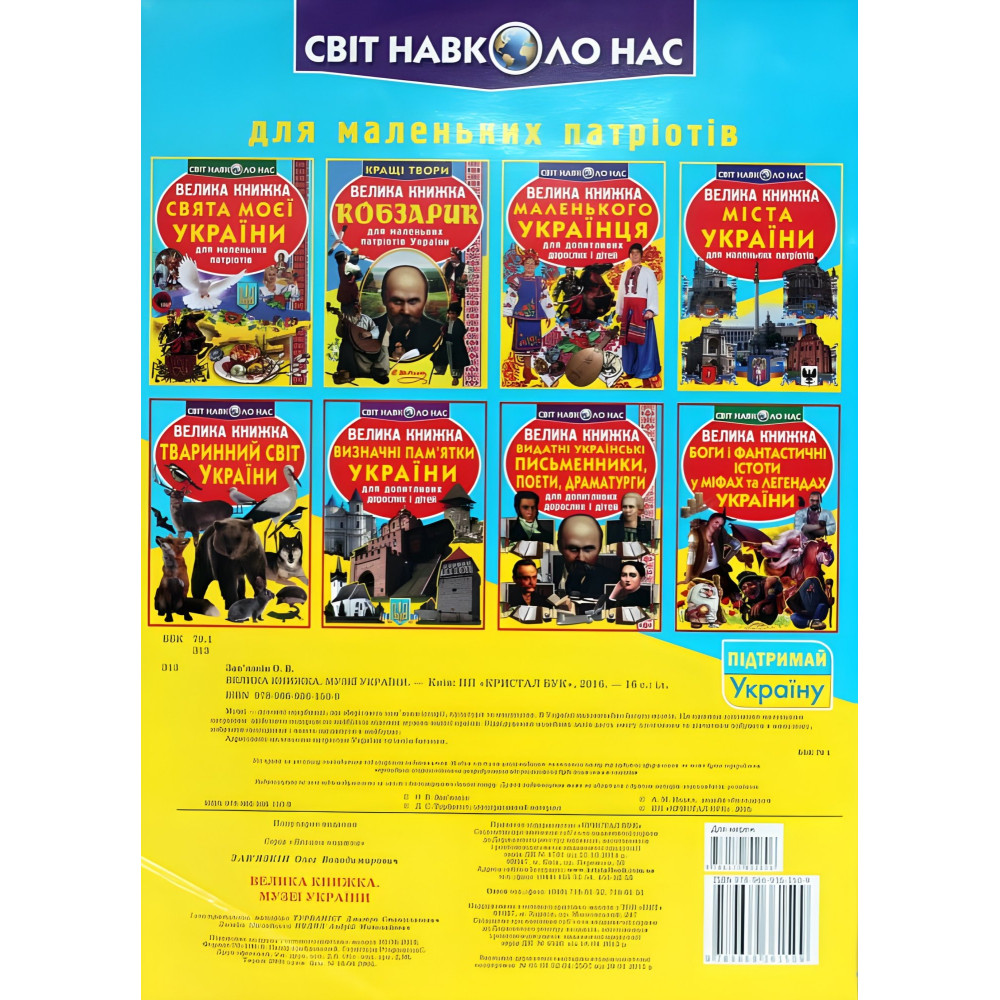 Музеї — духовні скарбниці, що зберігають пам'ять пам'ятки історії, культури та мистецтва. В Україні надзвичайно багато музеїв. Ця книжка допоможе маленьким патріотам здійснити подорож по найбільш відомих музеях нашої країни. Відвідування музейних залів дасть змогу хлопчикам та дівчаткам побувати у минулому, побачити сьогодення і навіть заглянути в майбутнє. Адресовано маленьким патріотам України та їхнім батькам.