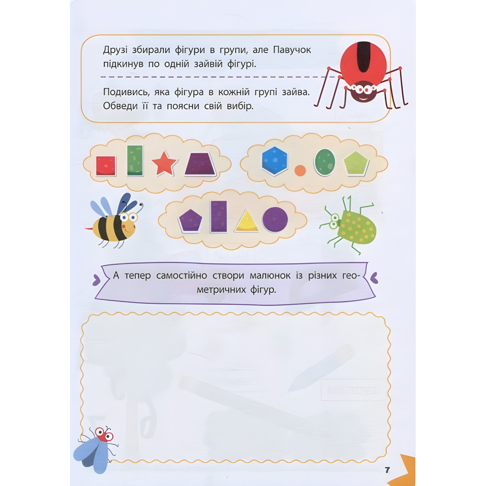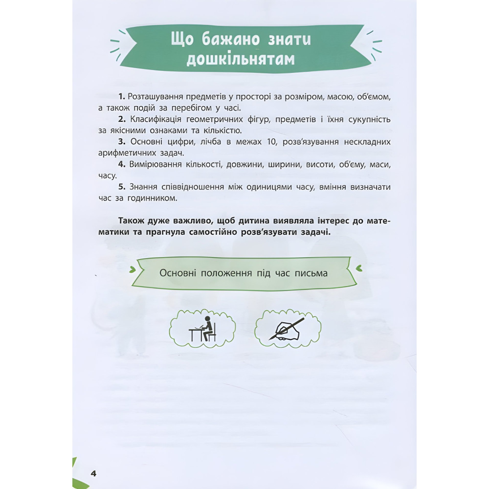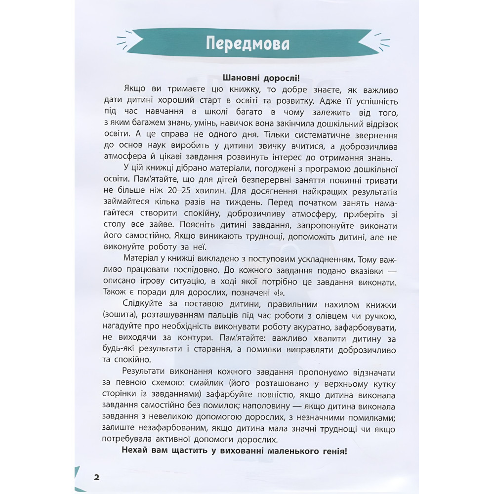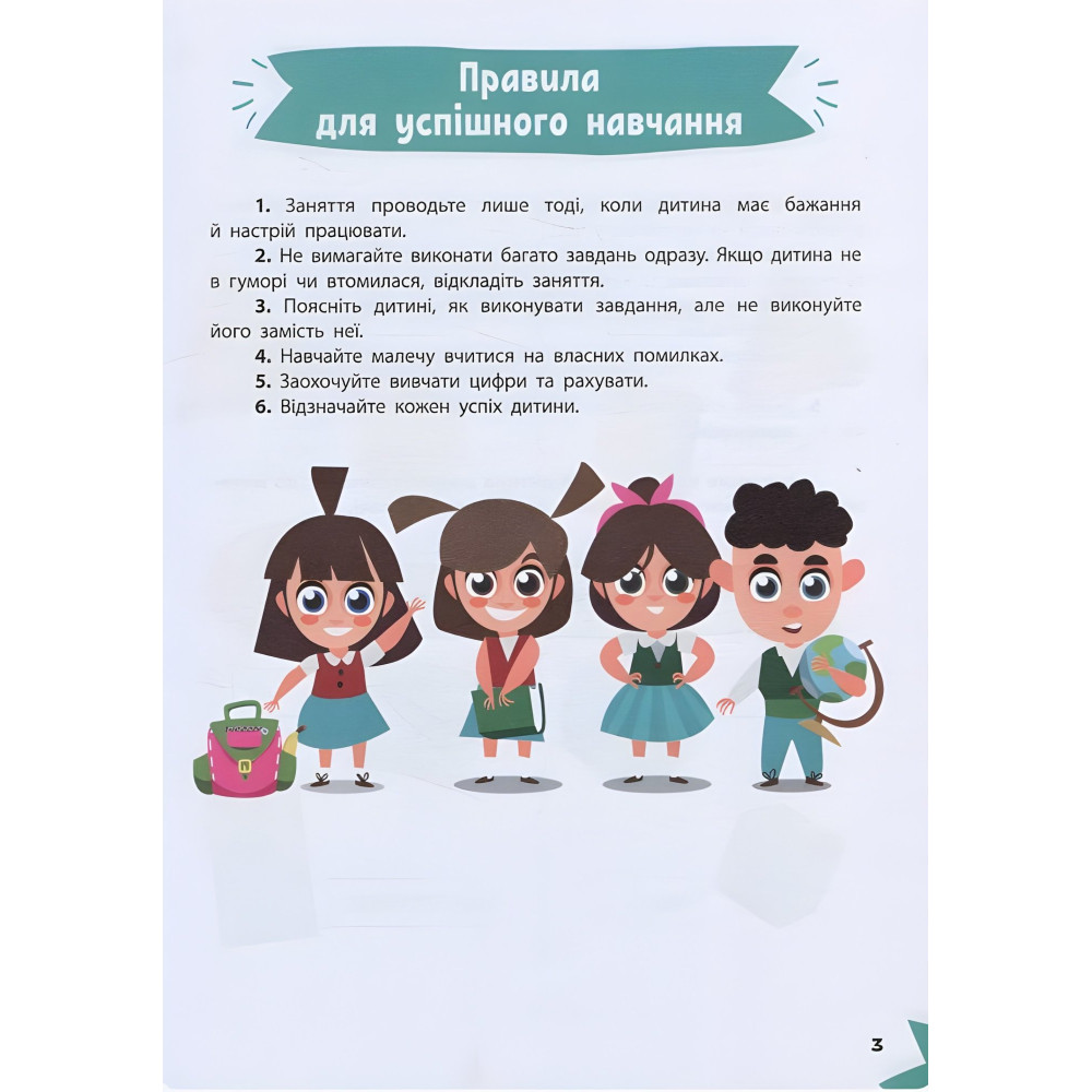 Витрачаючи на одне заняття не більше 20 хвилин, дитина здобуде важливі знання та вміння, опанує нові навички Регу-лярно працюючи з нашою книжкою, малюк ознайомиться з цифрами й числами, навчиться розрізняти геометричні фігури, розв’язуватиме математичні приклади й розвиватиме логічне мислення. А дотепні та захопливі завдання перетворять навчання на веселу гру!