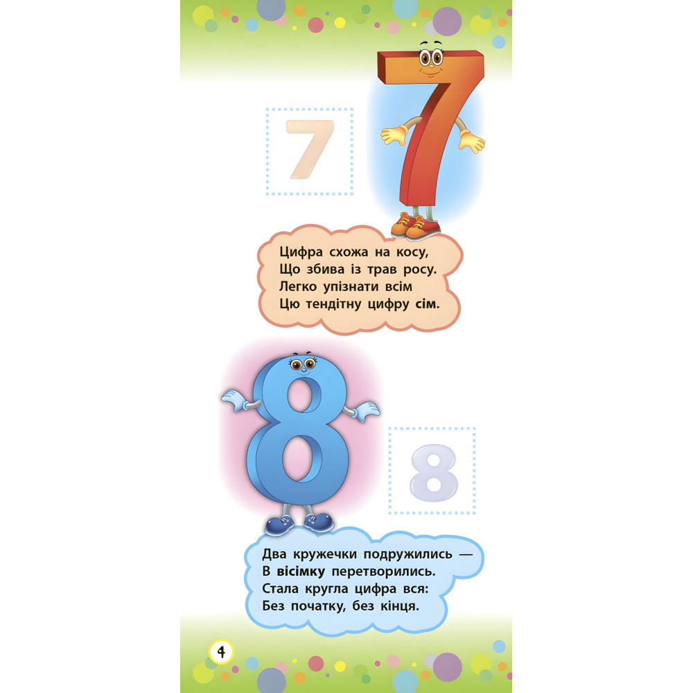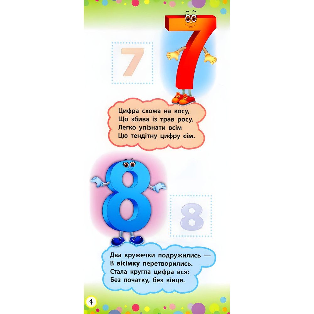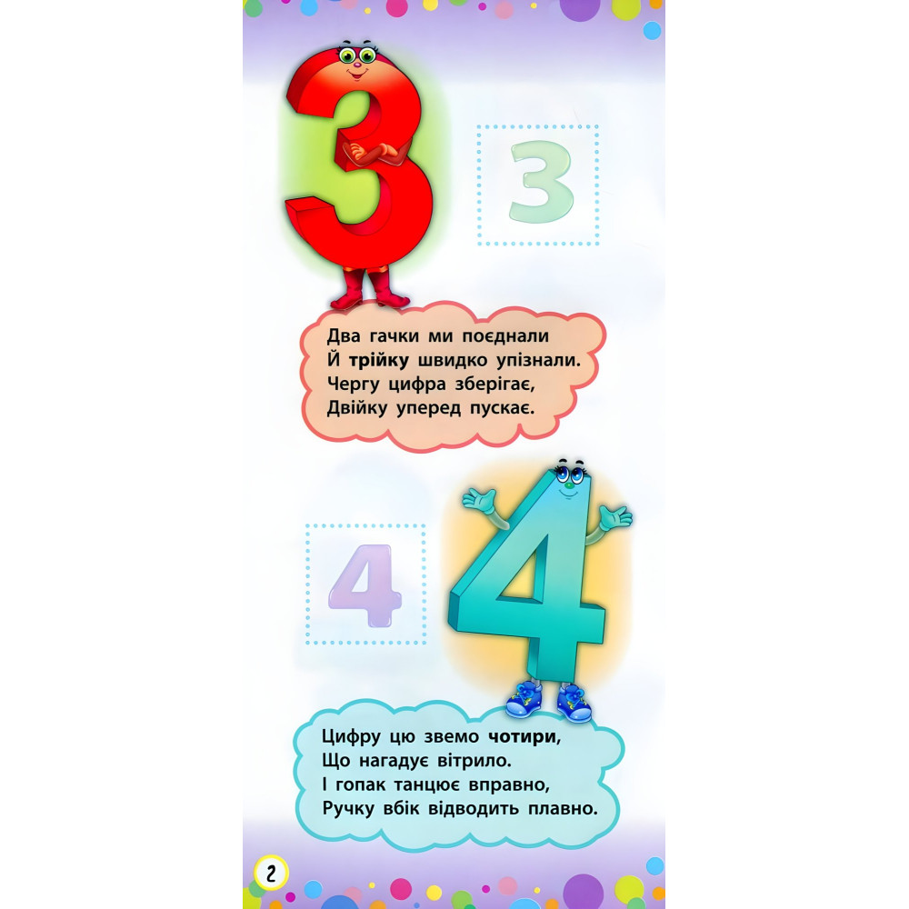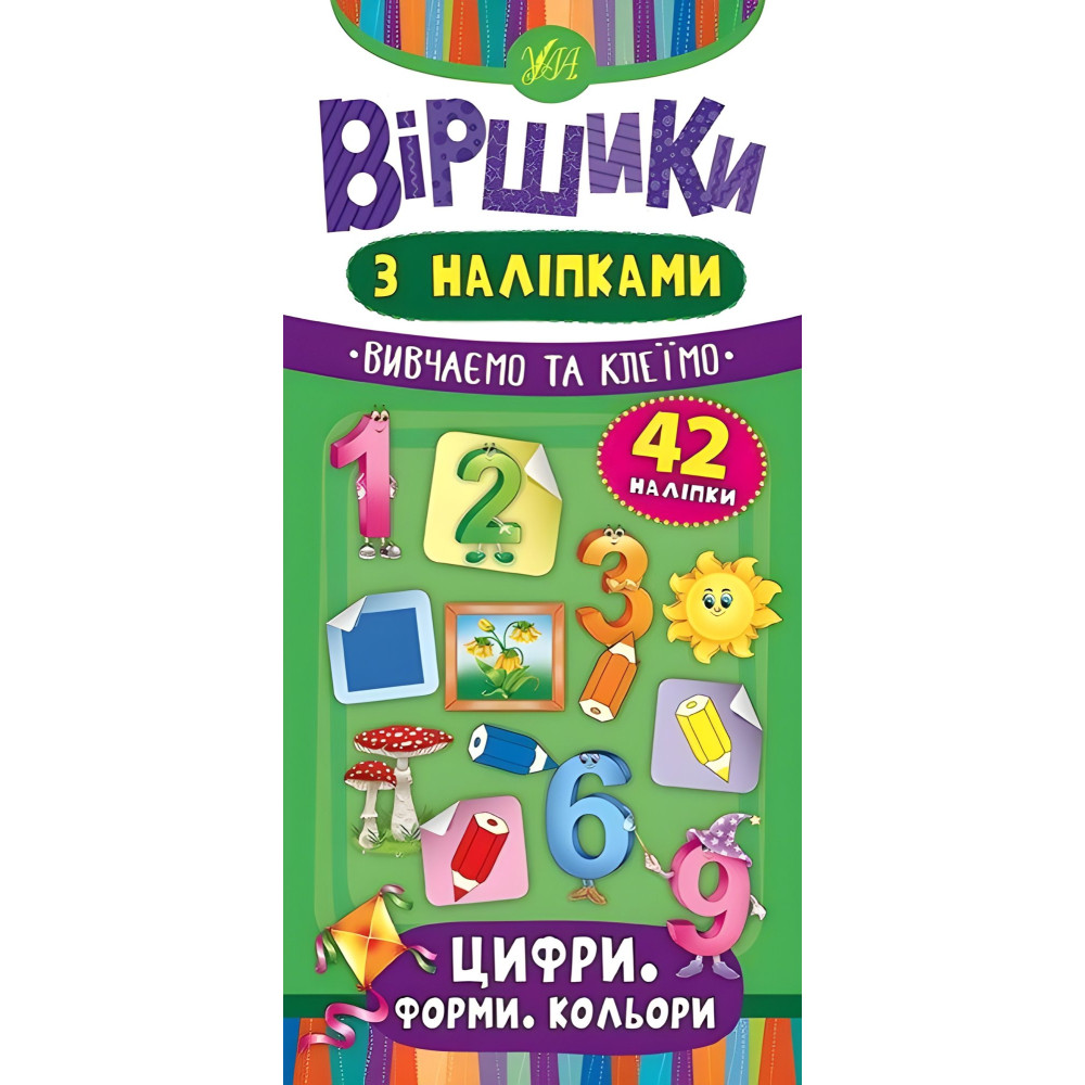 Ця книжка у веселій і цікавій формі познайомить ваших дітей із цифрами, формами та кольорами. Пізнавальні віршики та яскраві картинки допоможуть малюкам легко й швидко, а головне — із задоволенням вивчити цифри, назви геометричних фігур і кольорів, а також розвинути зорове сприйняття, уяву та пам’ять. Робота з наліпками неодмінно приверне увагу дитини, урізноманітнить процес навчання та не дозволить нудьгувати. Перетворіть дозвілля дитини на цікаву гру!