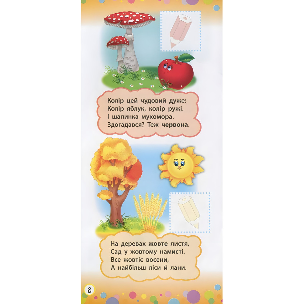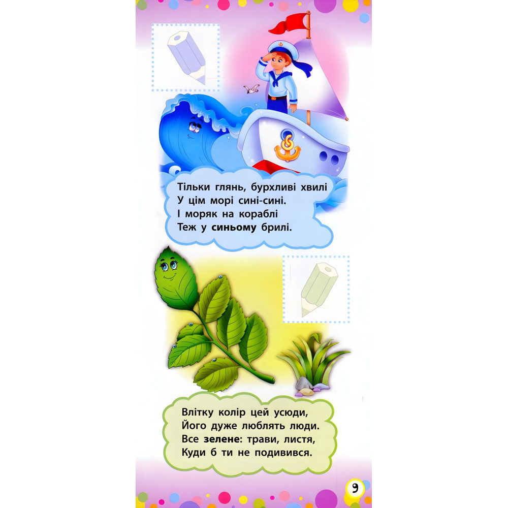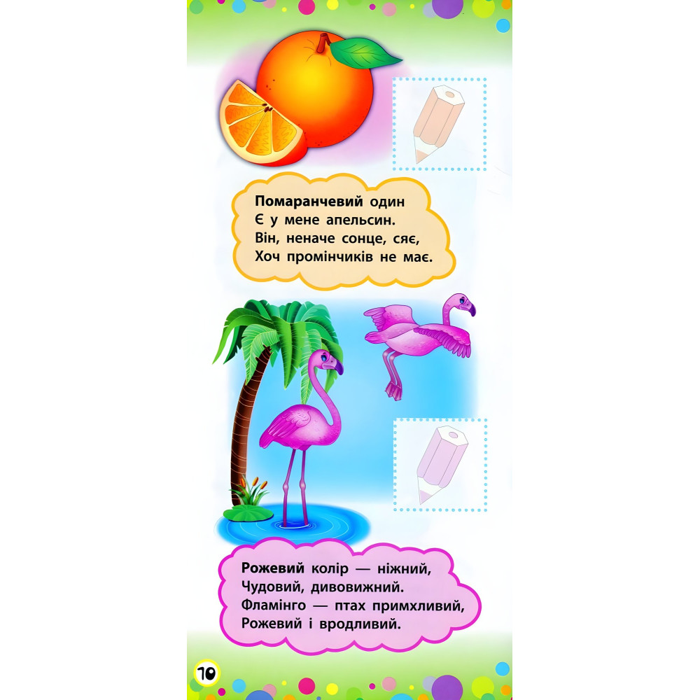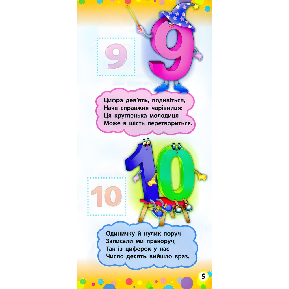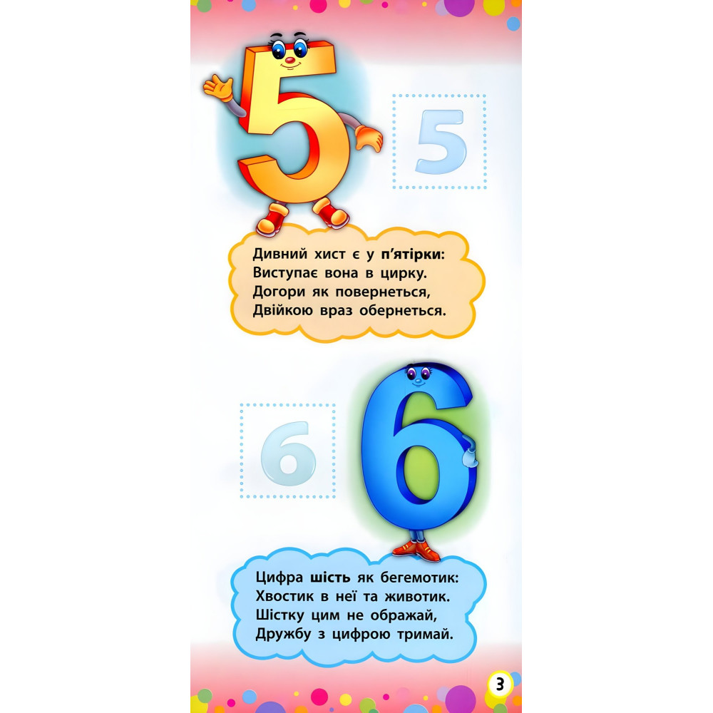 Ця книжка у веселій і цікавій формі познайомить ваших дітей із цифрами, формами та кольорами. Пізнавальні віршики та яскраві картинки допоможуть малюкам легко й швидко, а головне — із задоволенням вивчити цифри, назви геометричних фігур і кольорів, а також розвинути зорове сприйняття, уяву та пам’ять. Робота з наліпками неодмінно приверне увагу дитини, урізноманітнить процес навчання та не дозволить нудьгувати. Перетворіть дозвілля дитини на цікаву гру!