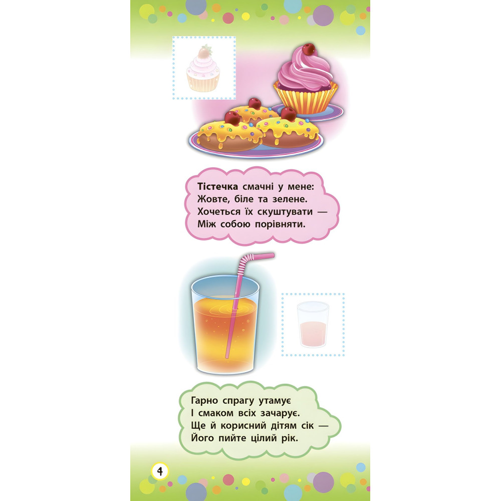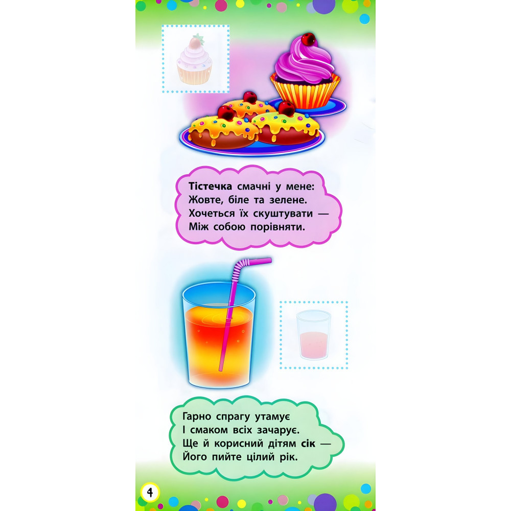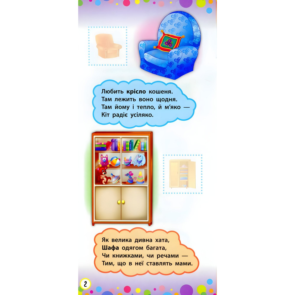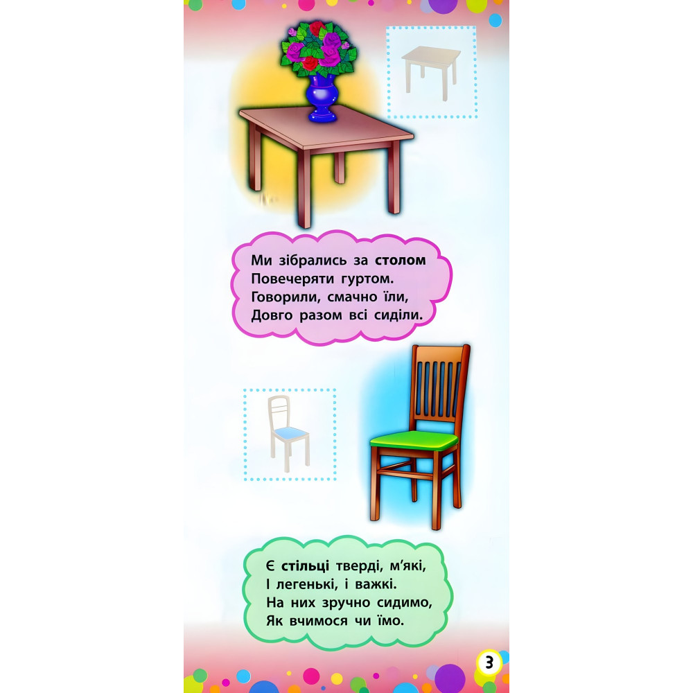 Ця книга у веселій і цікавій формі познайомить ваших дітей із предметами та явищами навколишнього світу. Пізнавальні віршики та яскраві картинки допоможуть малюкам легко та швидко, а головне — із задоволенням вивчити назви меблів, страв, одягу, природних явищ і пір року, а також розвинути зорове сприйняття, уяву та пам'ять. Робота з наклейками неодмінно приверне увагу малюка, урізноманітнить процес навчання й не дасть змогу нудьгувати. Перетворіть дозвілля дитини на цікаву гру!