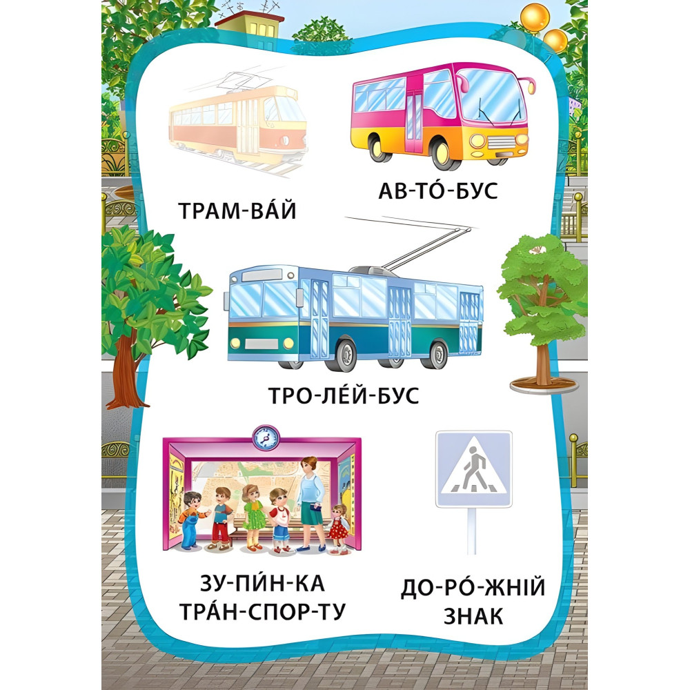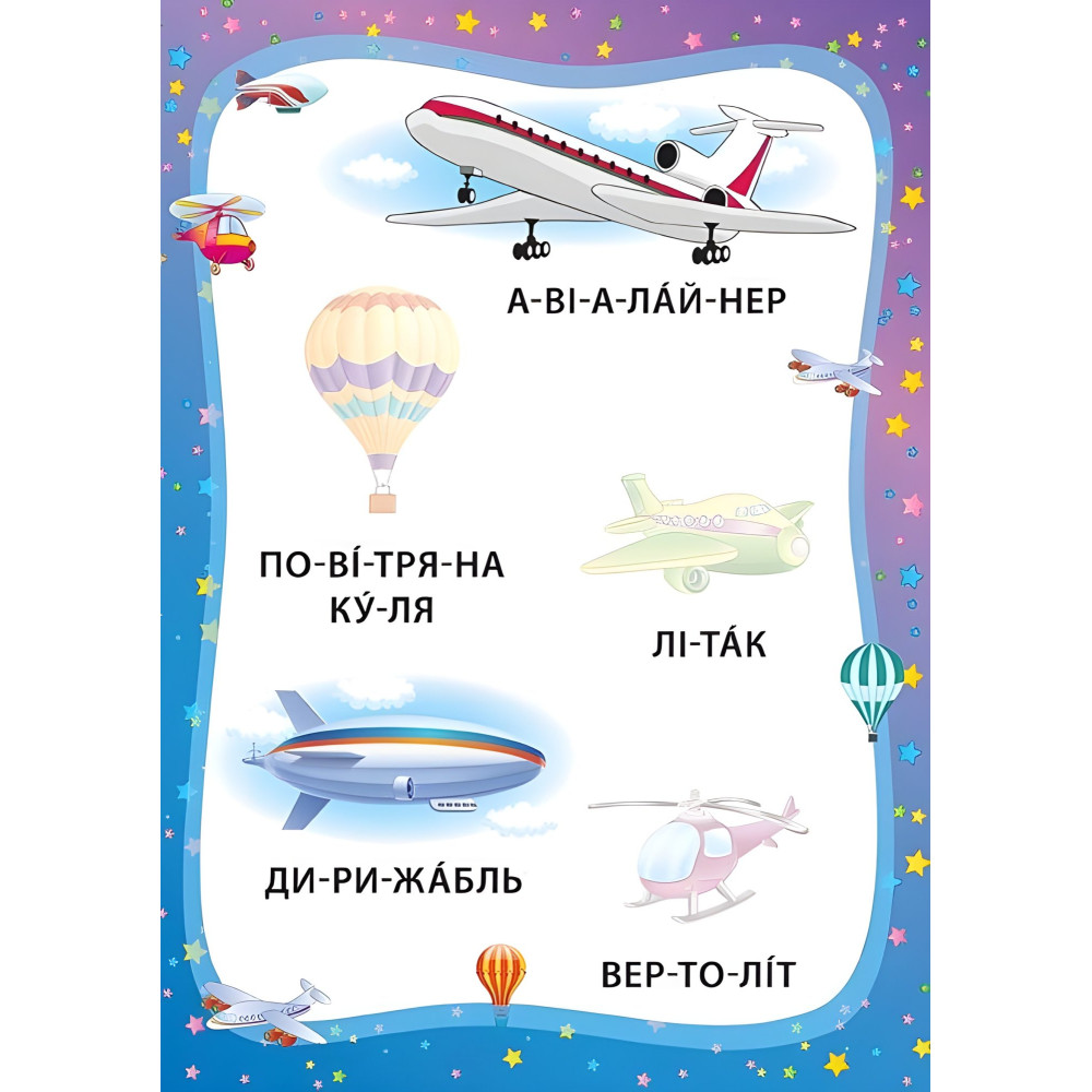 Ця книжка допоможе малюкам навчитися читати по складах і є ятати назви різних транспортних засобів та корисних машин, розвинути дрібну моторику пальців рук, зорову пам'ять й увагу. Видання містить яскраві ілюстрації, тематичні наліпки й підписи до шкірного малюнка. Крім того, слова поділені на склади та надруковані зручними для сприйняття великими літерами.Усе це зробить складний процес читання легким і захопливим.