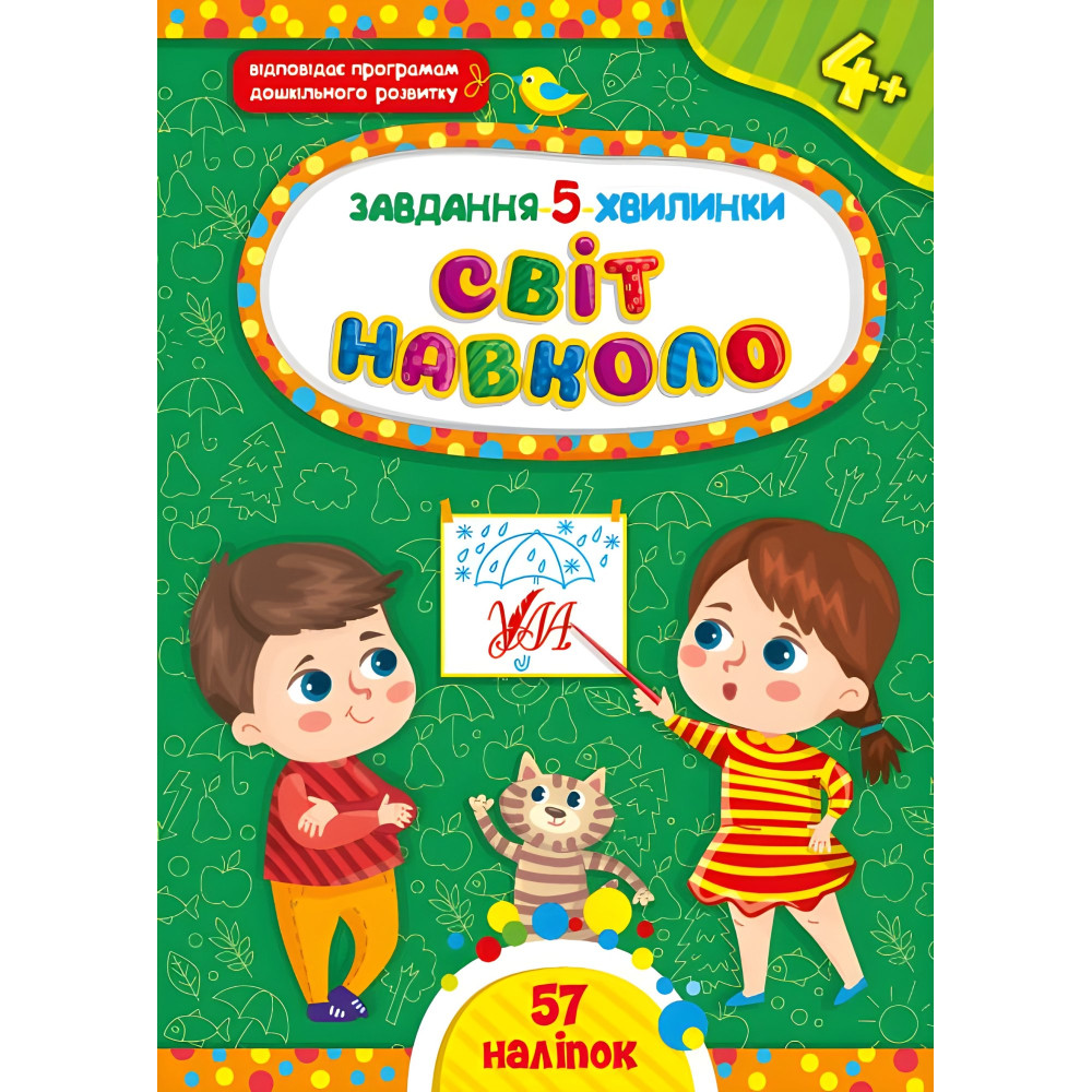 "Серія «Завдання-5-хвилинки» створена для гармонійного розвитку дитини від 2 до 6 років. Чотири лінійки серії — «Прописи», «Логіка», «Світ навколо», «Читання» — укладені відповідно до віку дитини та програм дошкільного розвитку. Цікаві завдання, виконання яких потребує орієнтовно 5 хвилин, спрямовані на те, щоб малюк встиг дізнатися щось нове чи повторити те, що знає, а головне — отримати задоволення від навчання. Видання допоможуть розвинути мислення, пам’ять, увагу, покращити мовленнєві здібності й потренувати дрібну моторику пальців рук. Яскраві ілюстрації та робота з наліпками перетворять роботу на захопливу гру. Книжка «Світ навколо. 5+» допоможе перевірити й закріпити знання дитини про навколишній світ. На кожній сторінці подано одне завдання, спрямоване на повторення чи вивчення тварин, їхніх улюблених ласощів і користі для людини, уявлення про розміри й вагу предметів, розуміння просторових відношень і того, що людина сприймає завдяки органам чуття, розрізнення часу доби й пір року. Тематичні наліпки доповнять й урізноманітнять роботу. Видання призначене для спільної роботи дорослих з дітьми віком від п’яти років.