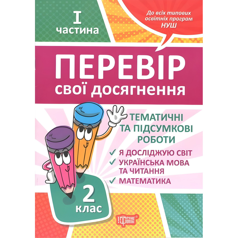 Посібники серії «Перевір себе» містять діагностичні роботи у двох рівноцінних варіантах для спостереження за процесом сприйняття та розуміння учнями навчального матеріалу та проведення тематичного оцінювання навчальних досягнень учнів другого класу з предметів «Я досліджую світ», «Українська мова та читання», «Математика».Посібник містить також завдання для підсумкової контрольної роботи в кінці навчального року. Зміст посібника «Перевір свої досягнення 2 клас. I та II частина» впорядковано відповідно до Державного стандарту початкової освіти та типових освітніх програм початкової школи.