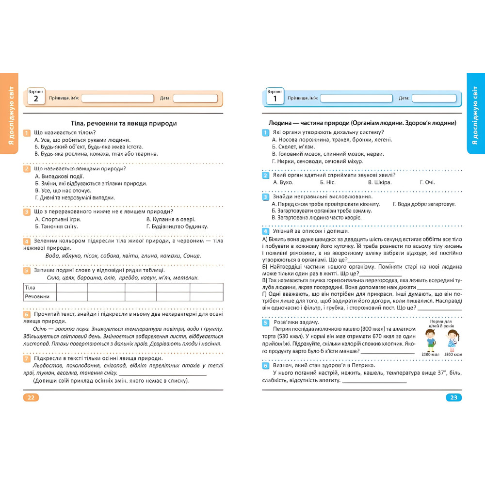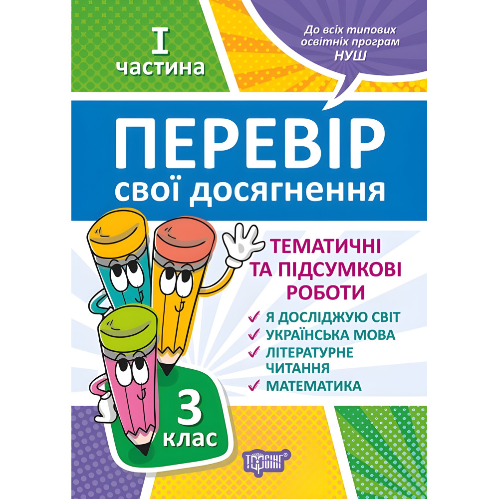 Посібники серії «Перевір себе» містять діагностичні роботи у двох рівноцінних варіантах для спостереження за процесом сприйняття та розуміння учнями навчального матеріалу та проведення тематичного оцінювання навчальних досягнень учнів третього класу з предметів «Я досліджую світ», «Українська мова та читання», «Математика». Посібник містить також завдання для підсумкової контрольної роботи в кінці навчального року. Зміст посібника «Перевір свої досягнення 3 клас. I та II частина» впорядковано відповідно до Державного стандарту початкової освіти та типових освітніх програм початкової школи.