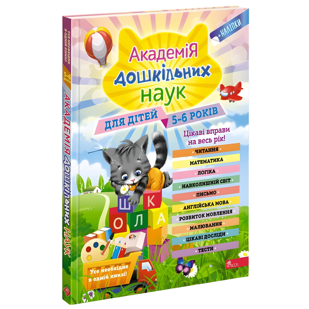 Завдяки «Академія дошкільних наук 5-6 років» дитина потренує увагу і зорове сприйняття, розвине пам'ять, мислення, уяву, дрібну моторику, розширить кругозір і словниковий запас. Книга допоможе грамотно організувати заняття, підкаже на що в першу чергу звернути увагу. Посібник складається з дев'яти розділів. Кожен з них вміщає цикл занять, спрямованих на опрацювання певних знань і навичок п'ятирічного малюка, і закінчується блоком перевірочних завдань. Розділи посібника: рахуємо і розв'язуємо; пишемо друковані літери; читаємо слова і речення; вивчаємо час; англійська мова; розвиваємо мовлення; вчимося малювати; розвиваємо логіку і мислення; дивовижні досліди; чи готовий я до школи? У пригоді стануть 48 яскравих наліпок, які допоможуть зацікавити дитину та налаштують її на позитивний результат.