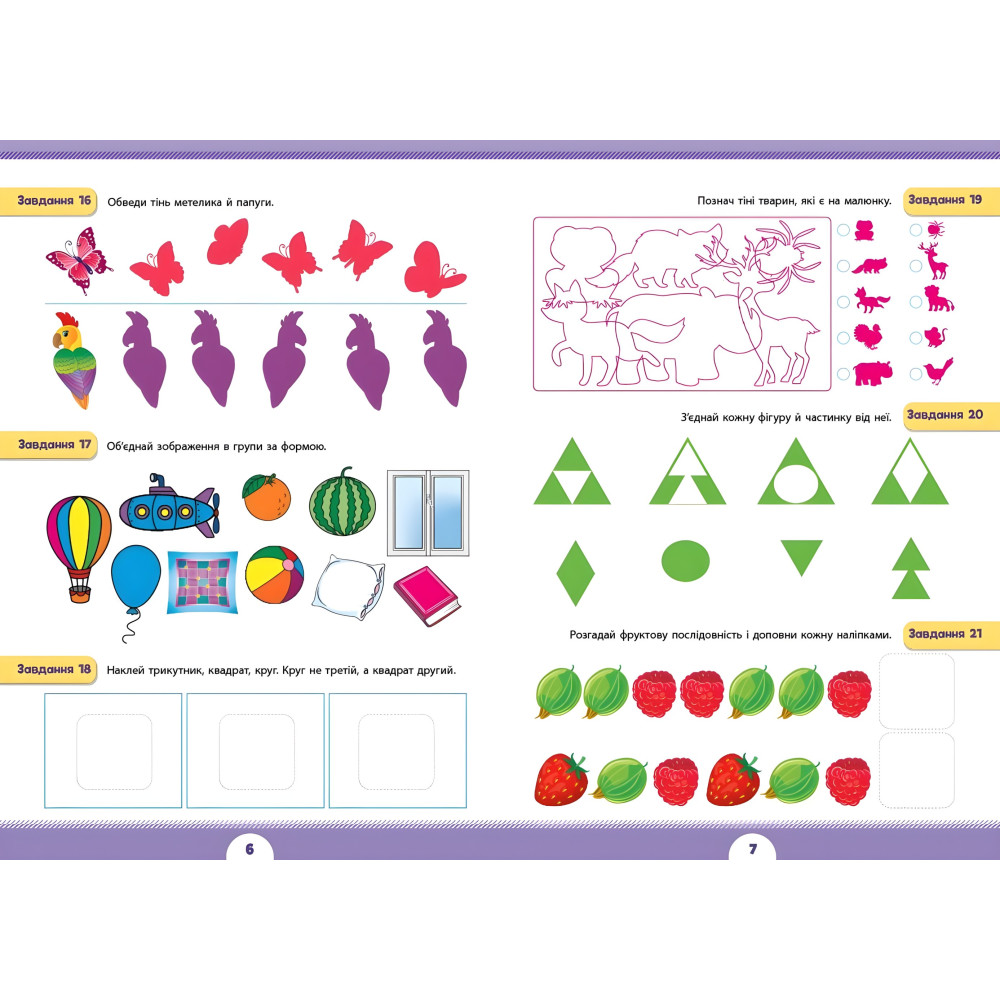 Із книжкою «Логічне мислення» дитина повправляється шукати спільне й відмінне між предметами, доповнювати логічні послідовності та розгадувати судоку, зіставляти предмети з їхніми тінями й віддзеркаленнями; орієнтуватися в просторі, визначаючи зображення фігур збоку й згори, а також доповнюватиме малюнки й малюватиме фігури й візерунки по клітинках.