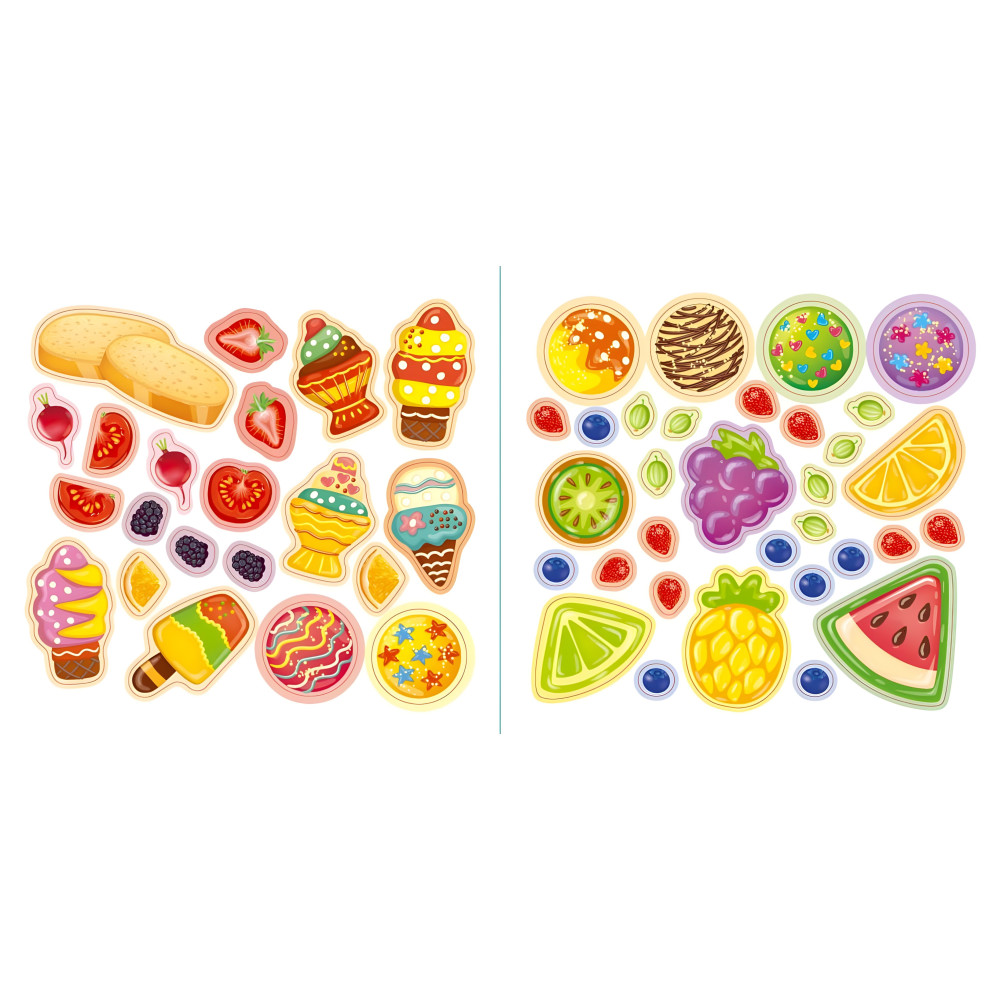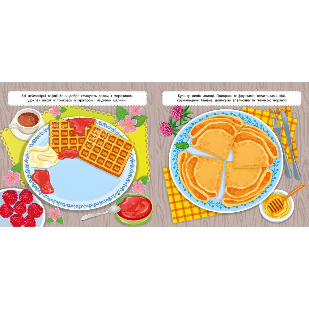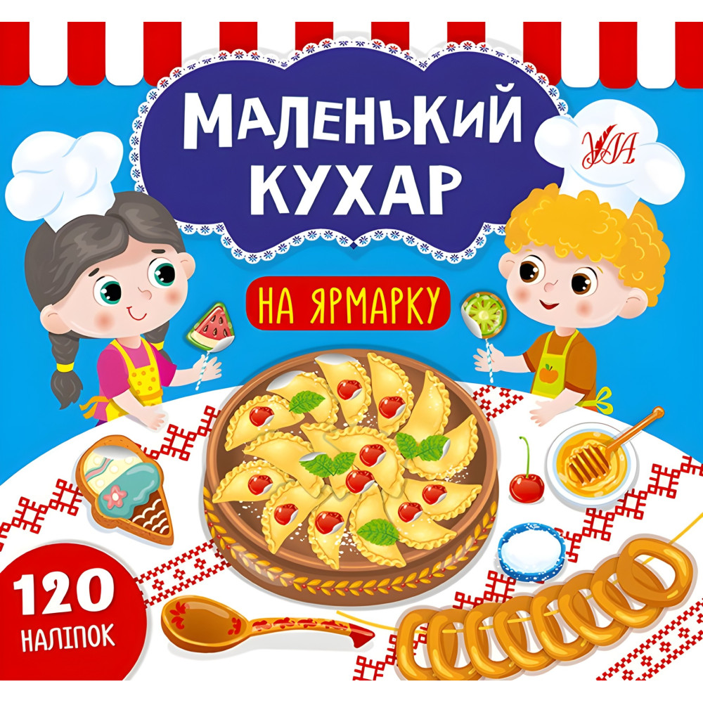 Разом із цією книгою дитина потрапить на ярмарку та зможе за допомогою наклейок прикрасити страви з варениками та галушками, таці з пряниками та морозивом, тарілки з вафлями та млинцями. Видання містить великі тематичні ілюстрації страв і різноманітні наклейки для їх декорування. Книга сприятиме розвитку фантазії, мовлення, уваги та дрібної моторики пальців рук.