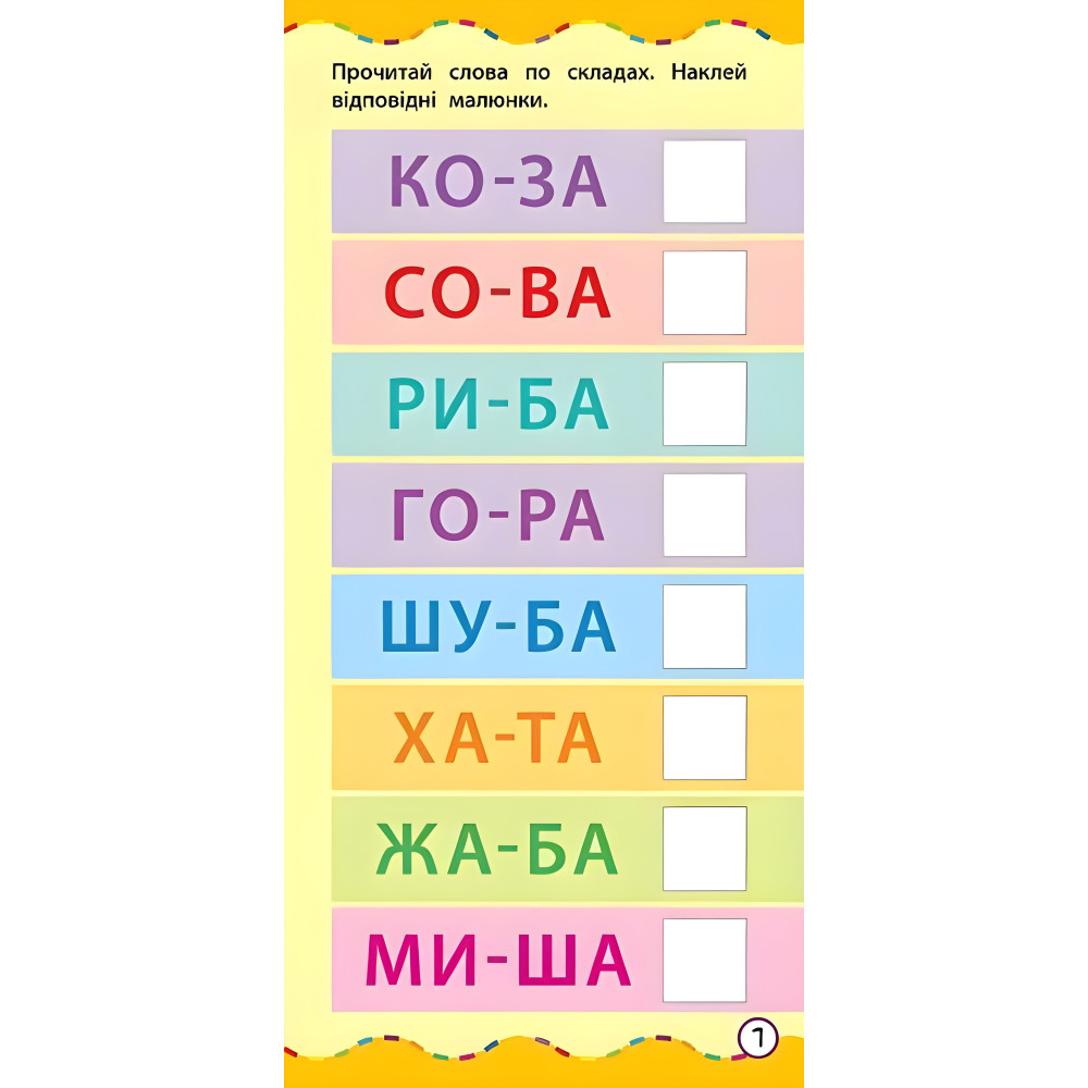 Із цією книгою ваша дитина легко та швидко навчиться читати по складах прості одно-, дво - та трискладові слова, а також потренується вставляти пропущені літери та склади за допомогою наліпок. Видання призначене для спільної роботи дорослих з дітьми дошкільного віку.