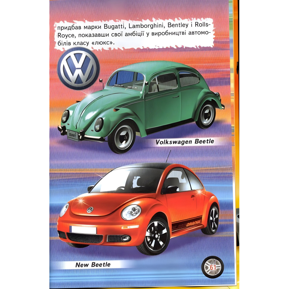 Ця книжка розповість юним читачам про автомобілі: про історію їх створення і перші автомобілі, про сучасні легкові автомобілі, автобуси і вантажівки, про їх класифікацію і основні характеристики. Ви дізнаєтесь також багато цікавого про перегонові автомобілі та популярні перегони, про автомобілі на альтернативних видах пального, про відомі автомобільні бренди.