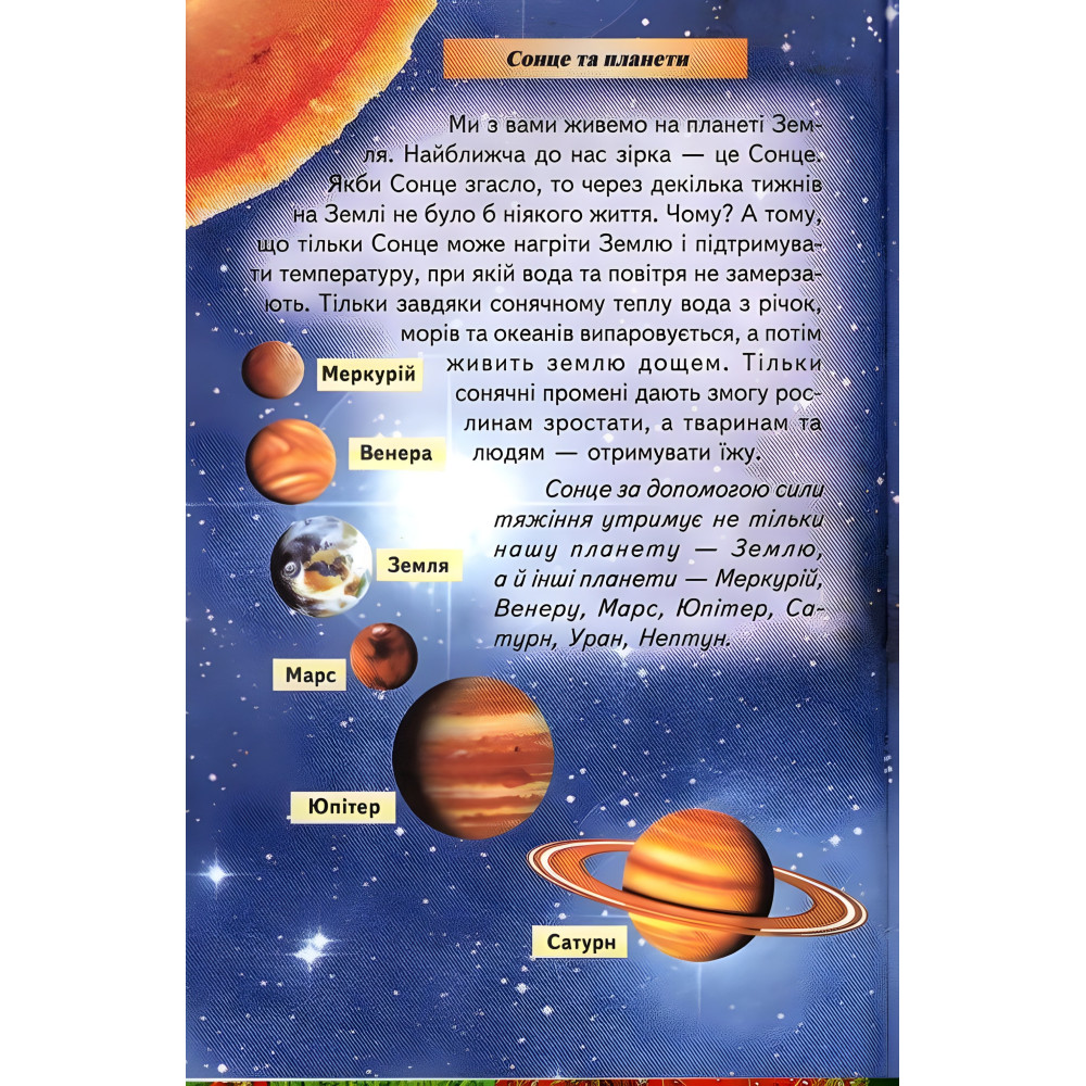 Читаючи разом з батьками цю книгу, малюки в доступній і цікавій формі познайомляться з навколишнім світом. Вони дізнаються багато цікавого про нашу планету Земля, про Сонце та Сонячну систему, про те, хто такі динозаври, як ростуть рослини, про різних дивовижних тварин. Книжка розповість про те, з чого складається наш організм, коли з’явилися санчата, лижі, велосипед, автомобіль тощо. Одним словом, малюкам відкриється багато див світу.