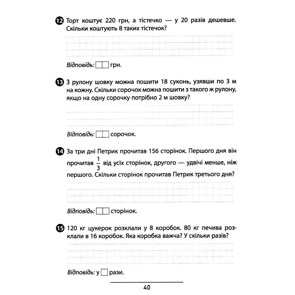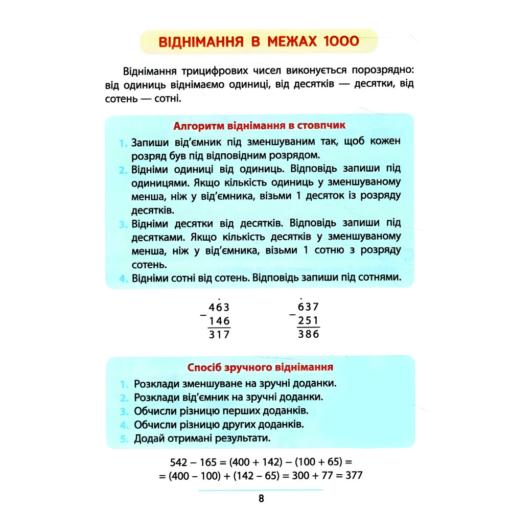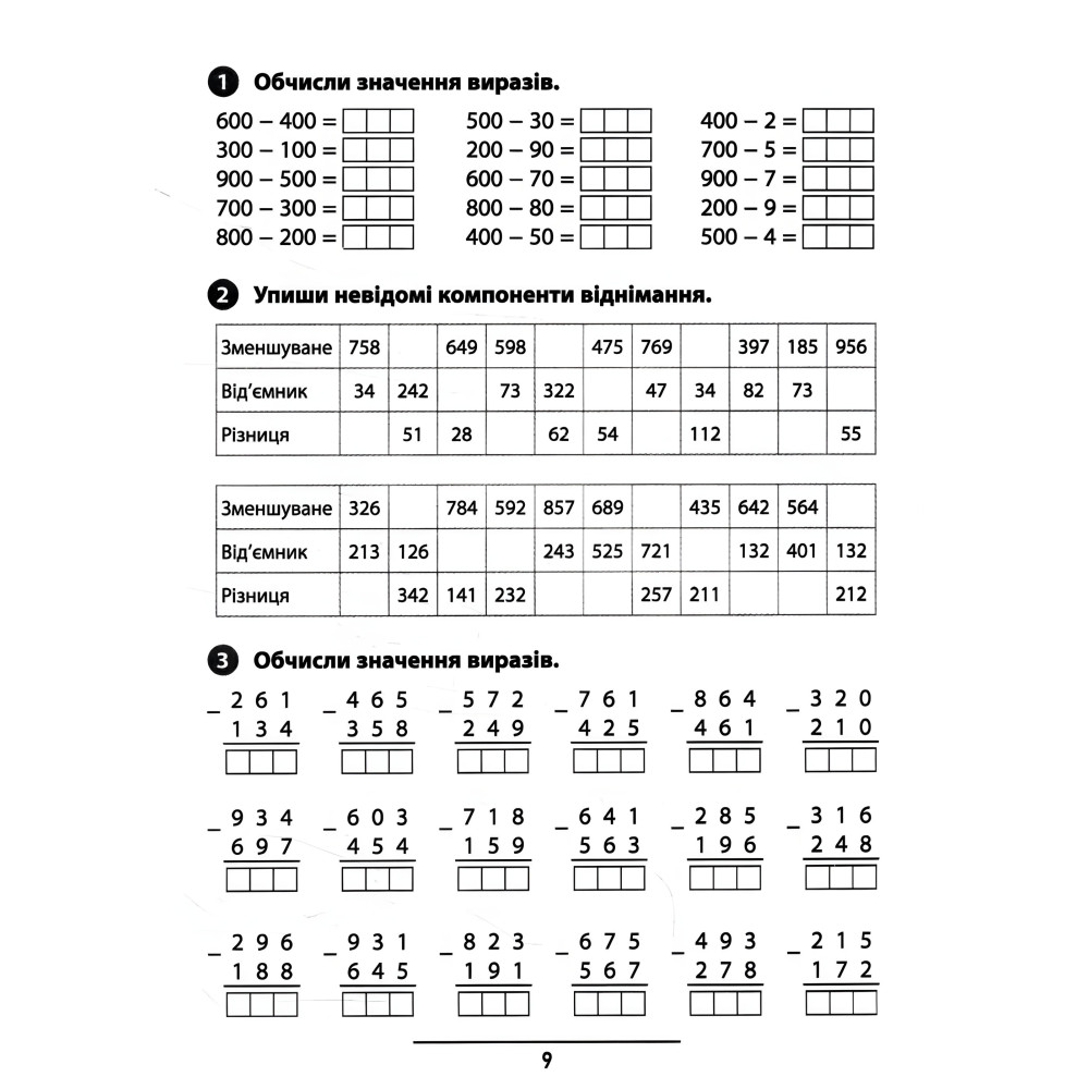 На сторінках цього посібника розміщено завдання, виконуючи які дитина закріпить знання про частини й дроби й повправляється їх знаходити, опанує розв’язання рівнянь, потренується додавати й віднімати, множити й ділити в межах 1000, попрактикується розв’язувати різноманітні задачі. Посібник побудовано з урахуванням дитиноцентризму, доступності й практичної спрямованості змісту. Видання відповідає Типовим освітнім програмам НУШ і стане в пригоді як додатковий тренажер на уроках, а також буде корисним для занять удома самостійно та з батьками. Книжка містить розмаїті завдання, що розвиватимуть уяву, мислення і дрібну моторику, стимулюватимуть зацікавленість дитини в навчанні. Видання призначене для учнів 3 класу, їхніх батьків і вчителів
