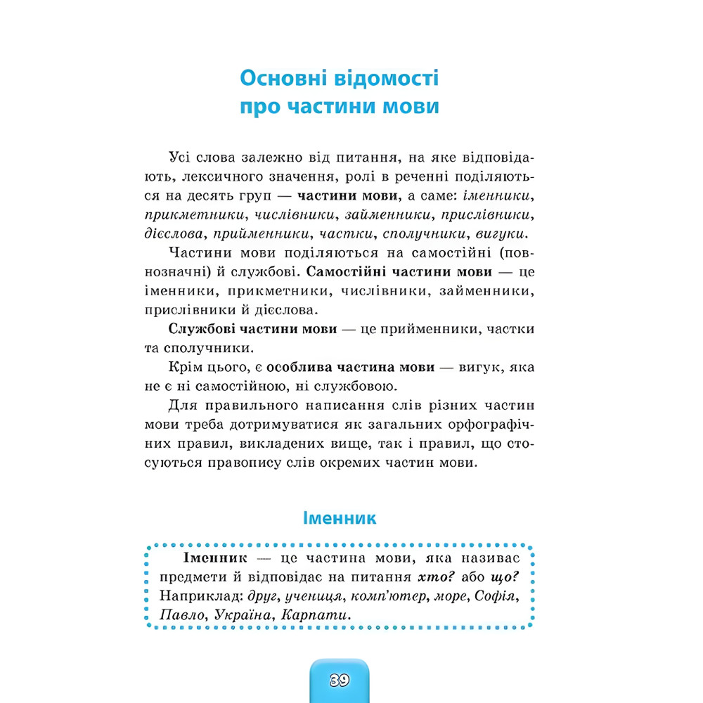 Довідник охоплює базовий матеріал з усіх розділів української мови для учнів початкових класів. Видання допоможе вивчити, повторити й узагальнити все, що треба знаті з українського правопису учням 1-4 класів. Правила викладені в стислій і доступній формі — у вигляді таблиць, схем і графіків. Книга призначений для учнів молодших класів, які хочуть підготуватися до уроків, контрольних і самостійних робіт, а також для всіх, хто прагне вивчити українську мову.
