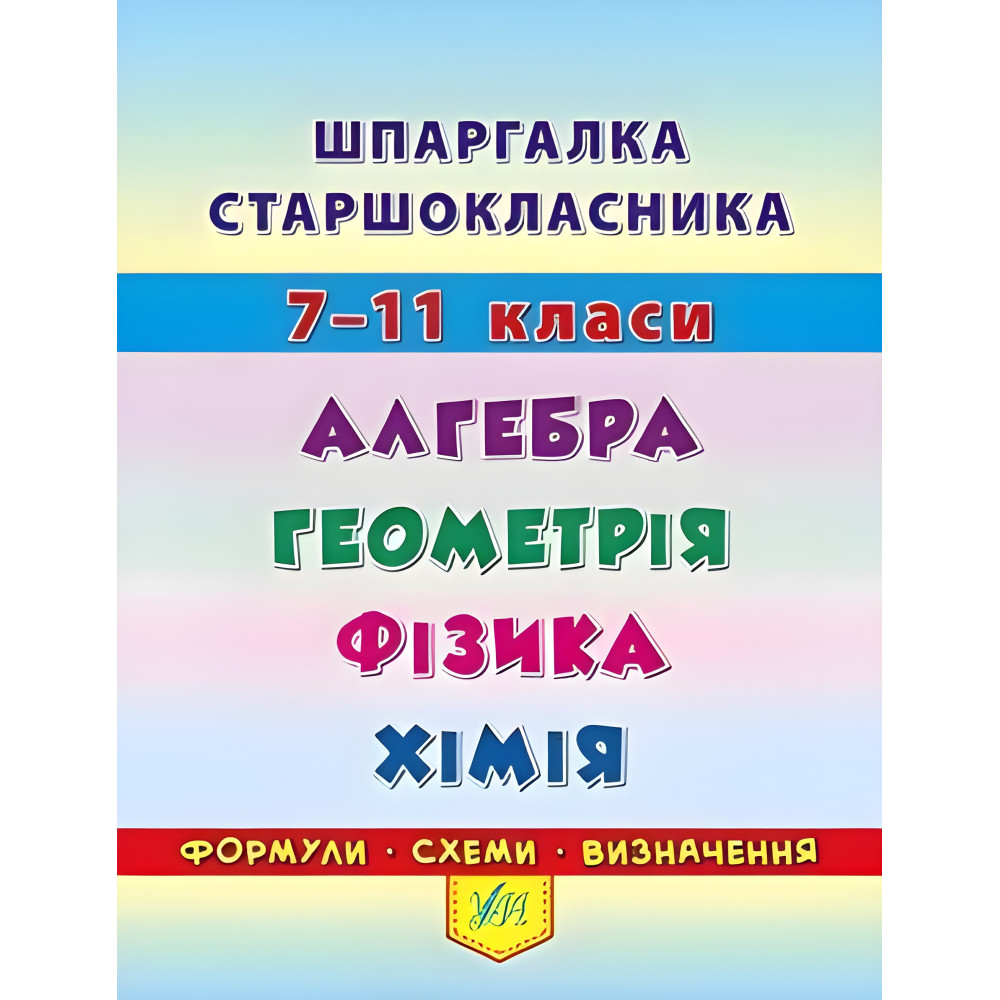 Це видання містить основні визначення, формули та схеми з алгебри, геометрії, фізики та хімії. Компактно структурований матеріал допоможе школяреві краще підготуватися до контрольної роботи, тематичного оцінювання та ЗНО. Зручний кишеньковий формат видання дозволить завжди тримати необхідну інформацію під рукою та швидко пригадати її за потреби.