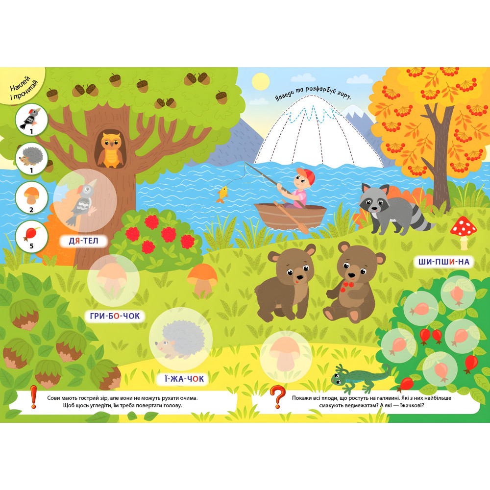 У цьому виданні дитина познайоміться з лісовими звірами та дізнається цікаві факти про них, повправляється в лічбі й читанні, наведе та розфарбує окремі предмети на малюнках, навчиться правильно визначати колір, форму й розмір, виконає розвивальні завдання, а також потренує увагу та дрібну моторику.
