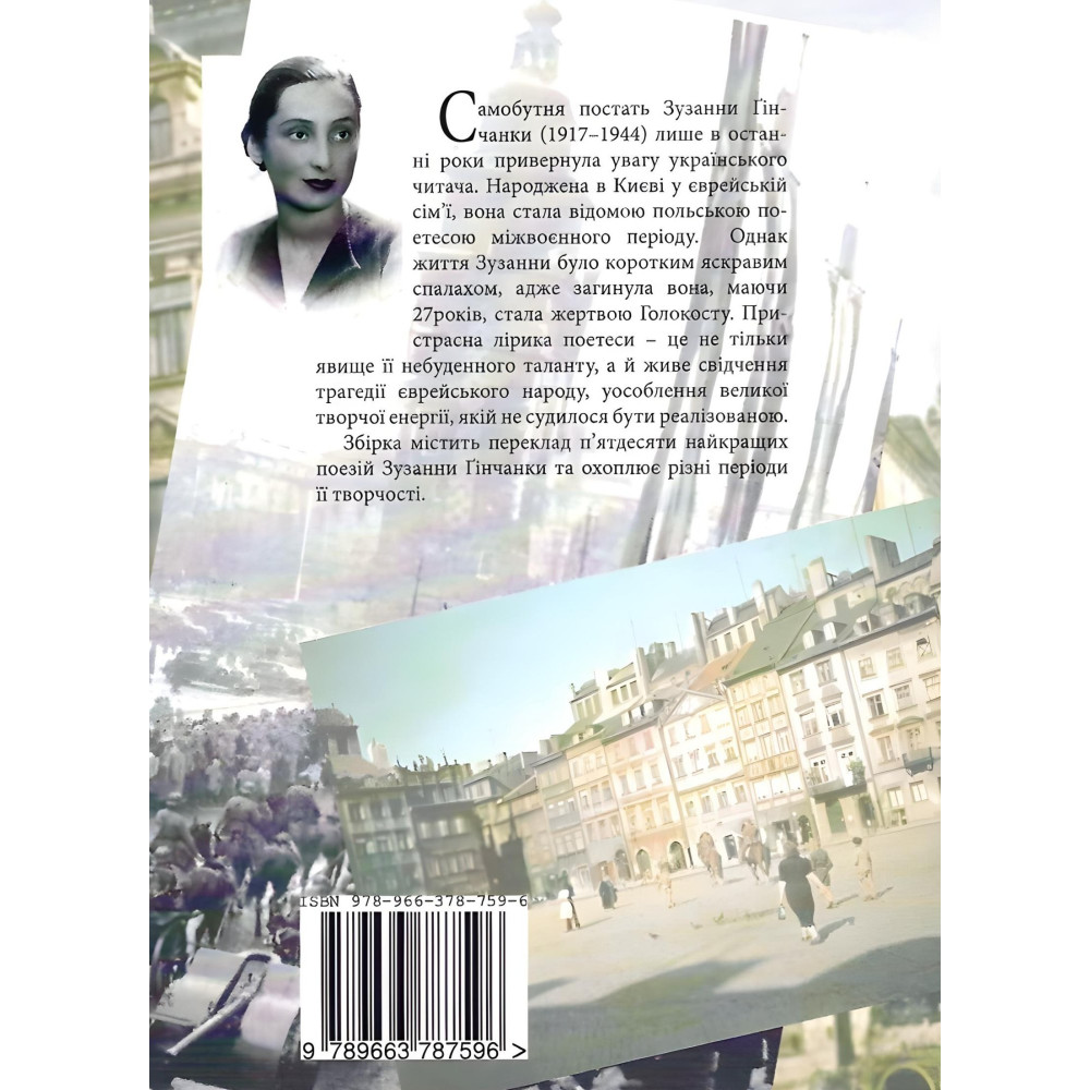 Самобутня постать Зузанни Ґінчанки (1917–1944) лише в останні роки привернула увагу українського читача. Народжена в Києві у єврейській сім’ї, вона стала відомою польською поетесою міжвоєнного періоду. Однак життя Зузанни було коротким яскравим спалахом, адже у віці 27 років стала жертвою Голокосту. Пристрасна лірика поетеси – це не тільки явище її небуденного таланту, а й живе свідчення трагедії єврейського народу, уособлення великої творчої енергії, якій не судилося бути реалізованою.
