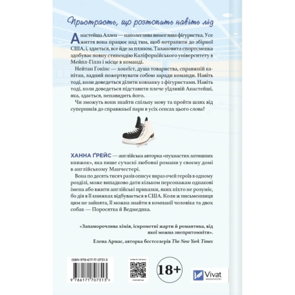 Анастейша Аллен — наполеглива, зосереджена на навчанні та фігурному катанні, де кожен рух має бути бездоганним. Нейтан Гокінс — капітан хокейної команди, сильний, уважний і значно глибший, ніж здається з першого погляду. Їхні світи не мали перетнутися… але одна випадкова домовленість змінює все.