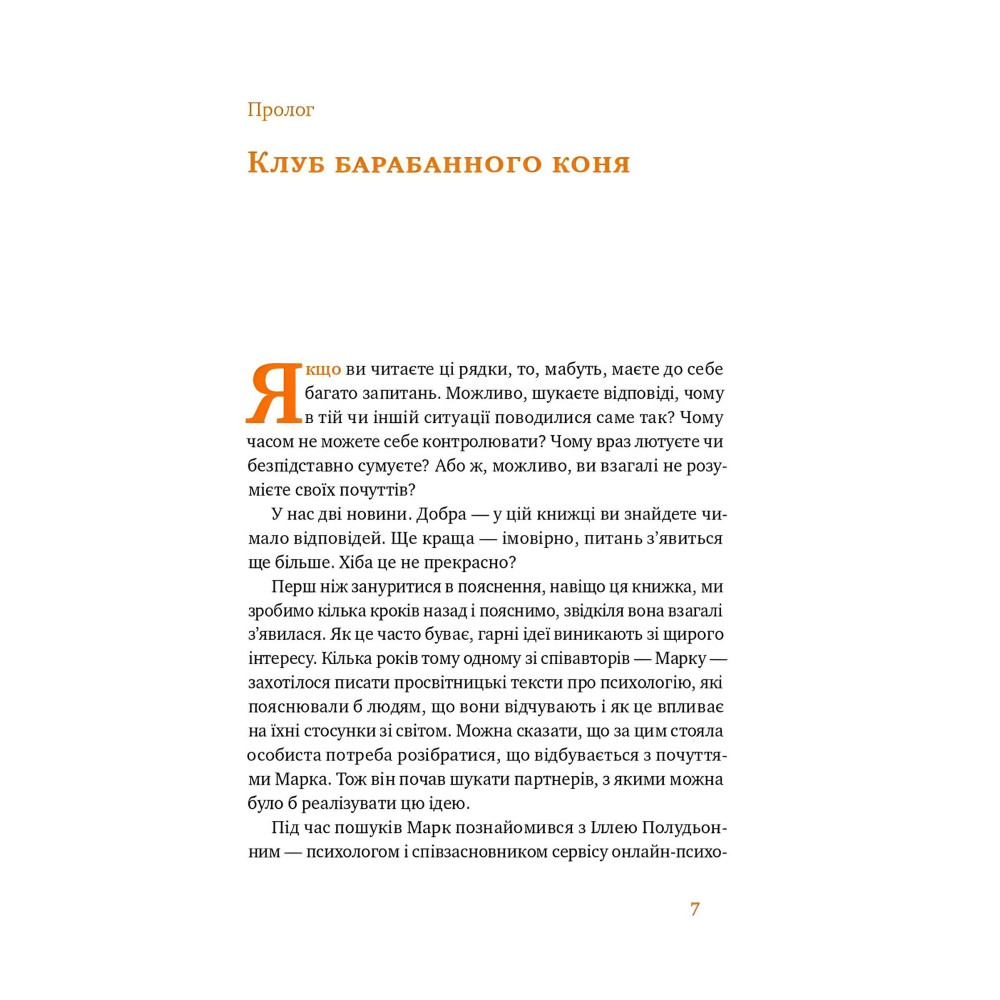 Розум: та все добре! У тебе є робота, дах над головою, їжа і друзі. Емоції: щось так тоскно. Якщо ви переживали схоже й не могли втямити, у чому річ — ця книжка для вас. У ній журналіст Марк Лівін і психотерапевт Ілля Полудьонний простими словами розповідають про емоції та почуття. Вони вчать розшифровувати повідомлення, що приходять у чат із самим собою: «Ти вже кілька днів сумуєш. Зверни на це увагу». Або: «Здається, ти заздриш другові, який знайшов нову роботу. Може, тобі теж час щось змінити?». Структурно книжка складається з 20 розділів. Кожен присвячується окремому почуттю чи емоції: злості, заздрості, образі, сорому, самотності тощо.